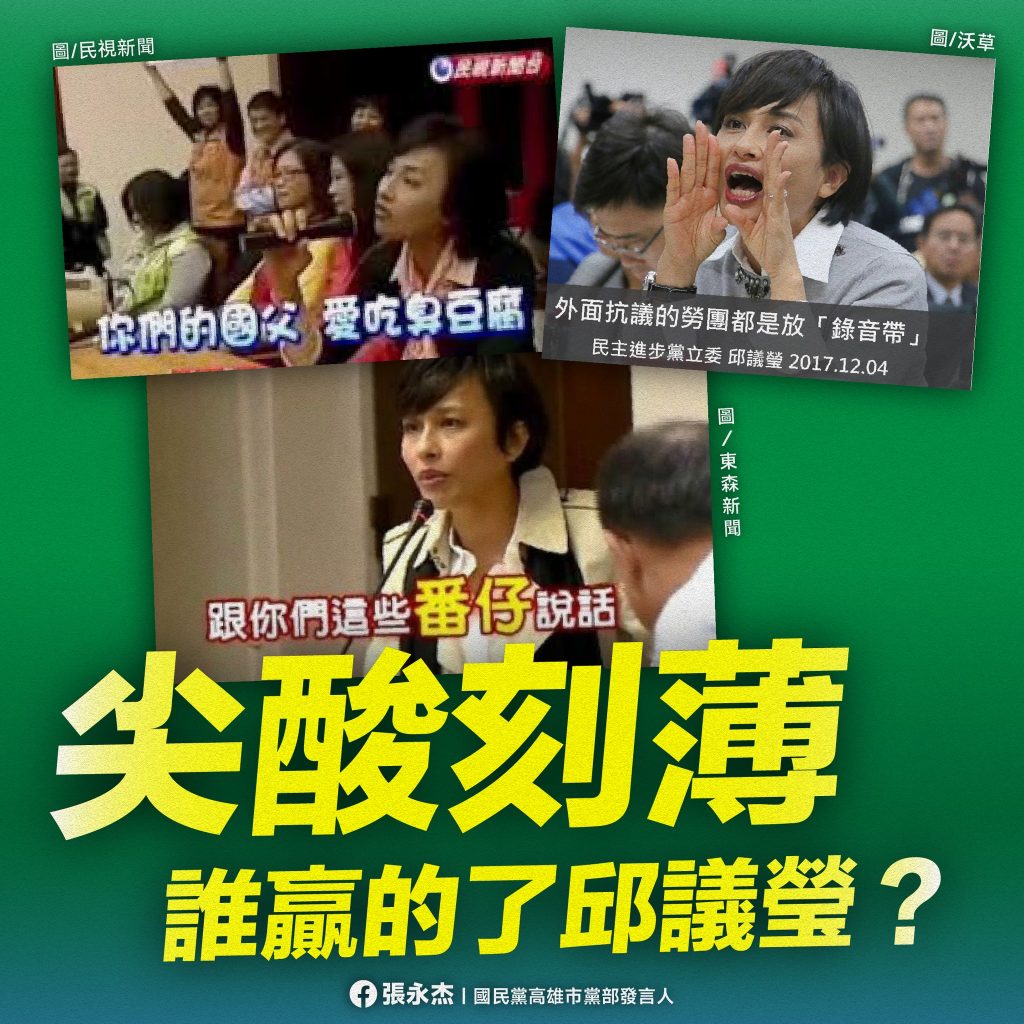 國民黨高雄市黨部發言人張永杰卅日質疑,尖酸刻薄,誰贏的了邱議瑩?