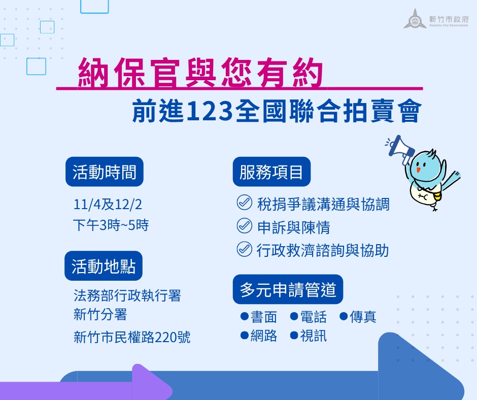 為主動服務民眾,新竹市稅務局納稅者權利保護官(下稱納保官)將於今(一一四)年十一月四日及十二月二日下午三時至五時前進法務部行政執行署新竹分署「一二三全國聯合拍賣會」現場,舉辦「納保官與您有約」活動,提供一對一、零距離的稅務諮詢與協助,讓市民在參與拍賣會的同時,也能獲得專業且即時的稅務指導,體驗更貼心便捷的服務。