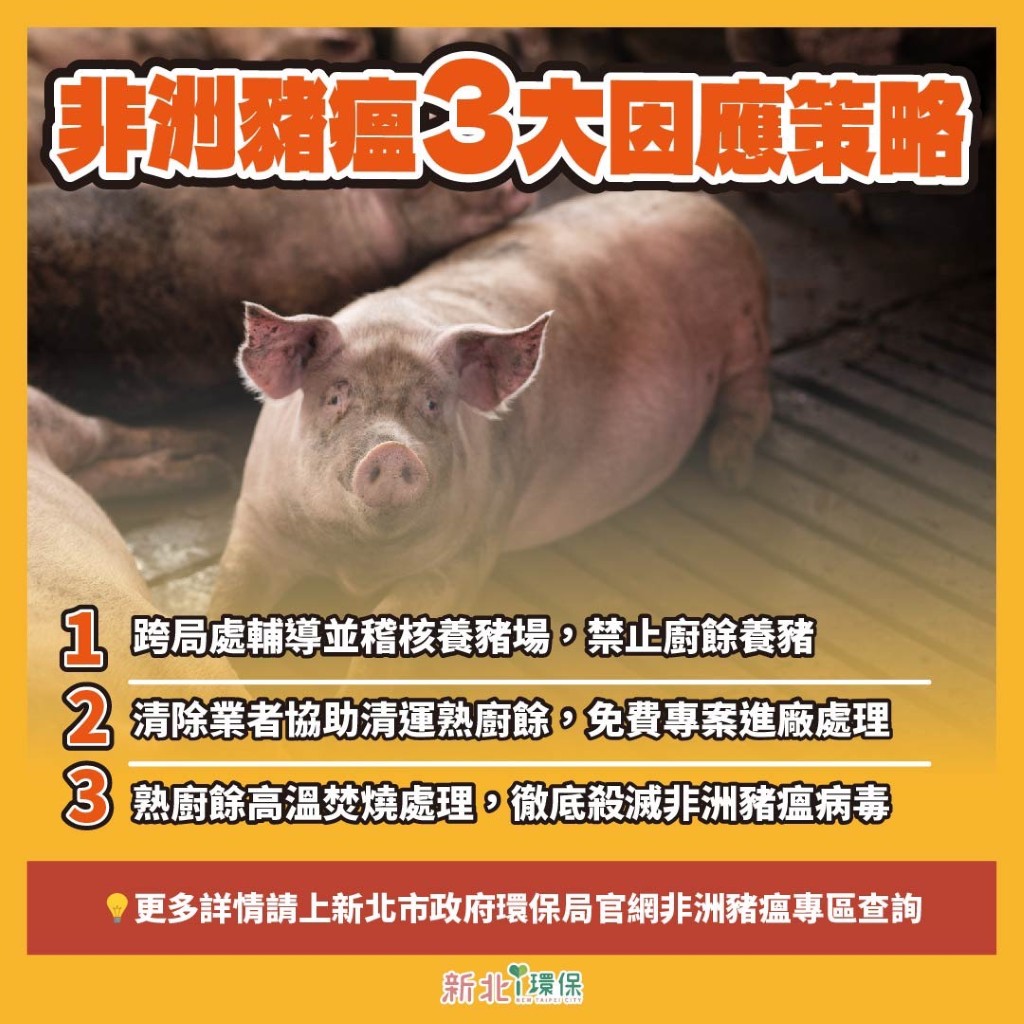 新北市政府指出,為防範非洲豬瘟疫情,農業部公告自10月22日起全面禁止搬運廚餘、動物性廢渣、畜禽屠宰下腳料至豬隻飼養場所,且不得作為飼料或飼料添加物使用。當(22)日農業局已同步通知轄內66場具廚餘再利用檢核的廚餘養豬場遵守規定,改以飼料或植物性廢渣餵養,並展開養豬場全面稽查。農業局30日主動聯合稽查小組至泰山區一處養豬場稽查,發現場內及業者車輛上存放含廚餘的桶槽,且廚餘蒸煮槽及飼料槽皆留有廚餘,明顯違反規定。立即要求業者將廚餘載運至樹林焚化爐銷毀,並以封鎖線封鎖廚餘槽,禁止再啟用。後續將依法裁處並持續至現場複查。