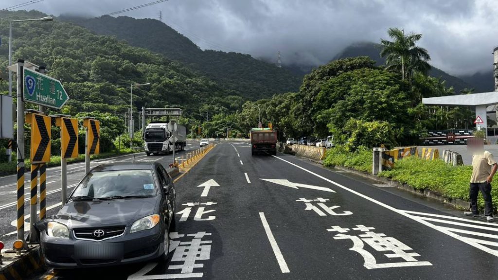 蘇花改東澳段三十一日上午發生一起交通事故,一輛南下砂石車行經台九線一一三點四公里處時,疑因轉彎不慎,加上視線死角未察覺前方車輛,撞上同向行駛黑色轎車左側,轎車當場旋轉一佰八十度後卡在分隔島上,所幸無人受傷。