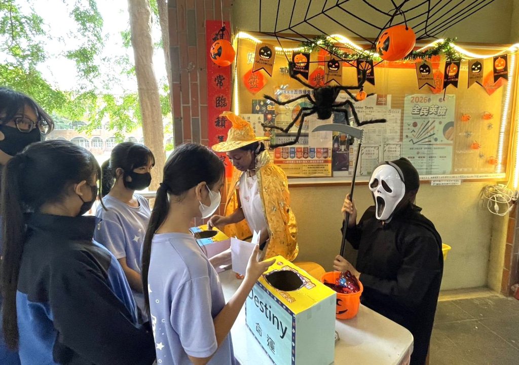 猜謎活動利用下課時間,讓每一位學生依序到指定地點進行「機會」或「命運」的二選一。抽中機會的孩子比較幸運,只需唸出及拼出由外師-南瓜仙子從機會箱當中的萬聖節圖卡單字,即可獲得小餅乾一份;而抽中命運的,則必須回答鬼王從命運箱所抽出的全英萬聖節謎語,但答對就能獲得限量萬聖節糖果一包。