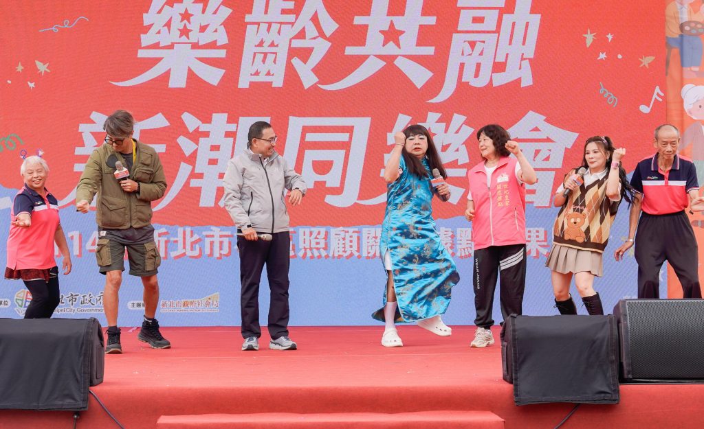 一場屬於長輩的青春派對!新北市社區照顧關懷據點成果展「樂齡共融、新潮同樂會」一日在板橋第一運動場登場,現場不僅有據點長輩帶來精彩表演與手作展攤,市長侯友宜到場和《高年級超進化》實境節目藝人董月花、王少偉、董仔與長輩同樂,在台上大玩互動遊戲,為活動掀起熱力高潮。