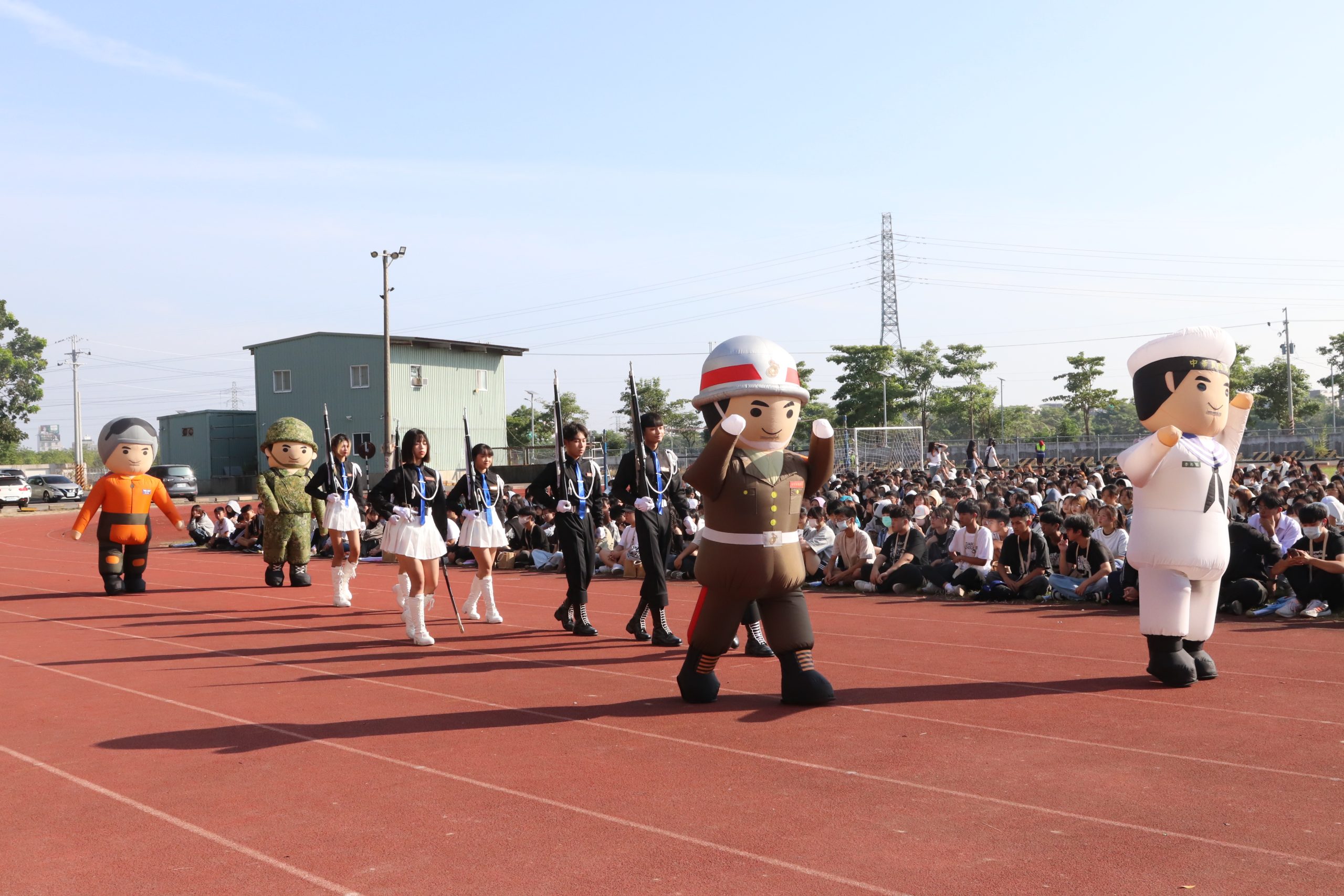 中華醫大校慶運動會上午八時三十分在學校操場舉行開幕式,國軍砲兵訓練指揮部及南部國軍人才招募中心結合學生社團帶來的戰鼓和儀隊表演、大頭娃娃兵唱跳助陣,為校慶運動會熱鬧揭幕。