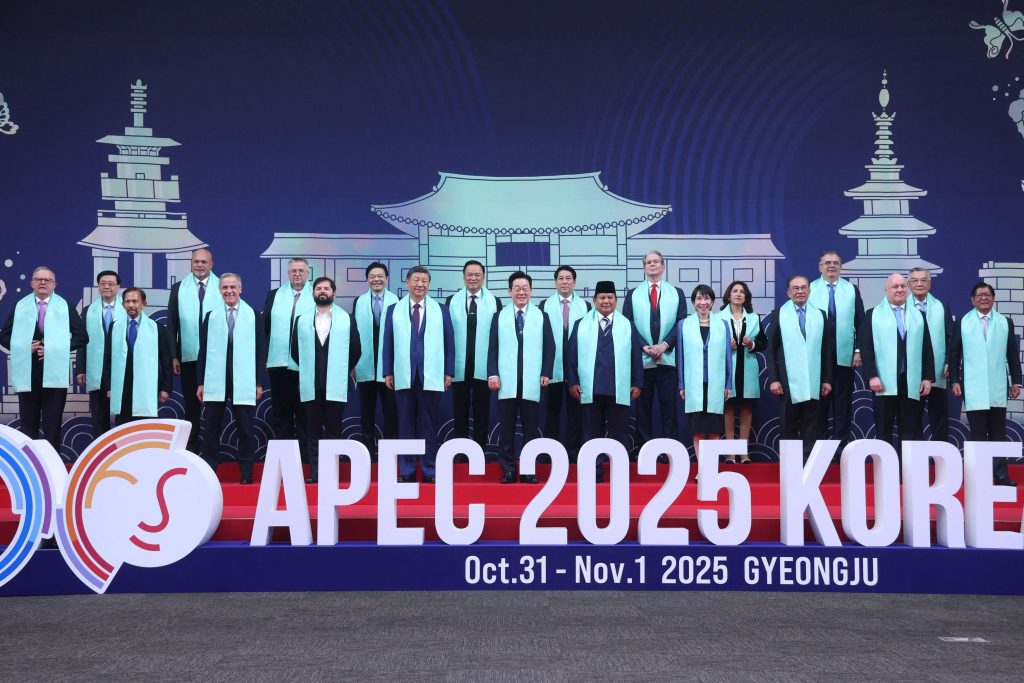 今年APEC由韓國主辦,領袖峰會地點位於韓國慶州,各國領袖在會議最後一天披上主辦國準備的玉色披肩進行大合照。李在明站在第一排正中間,左邊是明年主辦國大陸領導人習近平,右邊分別是印尼總統普拉伯沃、日本首相高市早苗;美國財政部長貝森特則站在普拉伯沃和日本首相高市早苗的後方。林信義合影位置位於第二排最右側,緊鄰著墨西哥經濟部長厄伯拉特,前方則是紐西蘭總理盧克森、菲律賓總統小馬可仕。