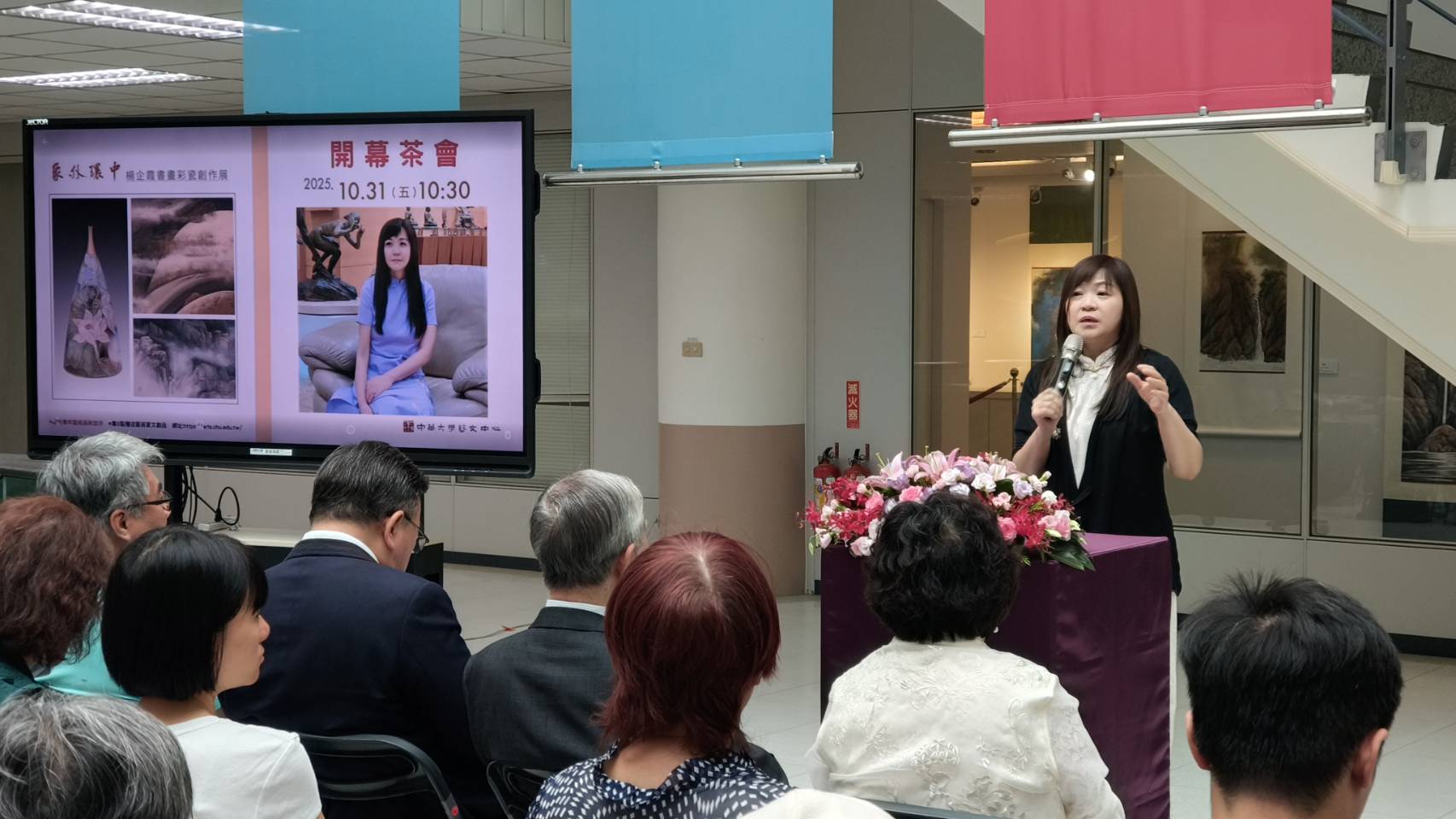 中華大學校長劉維琪致詞時表示,校內藝文中心成立二十餘年,長期致力推動人文與美學教育,期望在科技與商業專業之外,讓學生在藝術的滋養中獲得心靈平衡與文化涵養。劉校長也肯定楊企霞老師在書畫與彩瓷創作領域的深厚造詣,展現出東方美學精神的現代延伸。