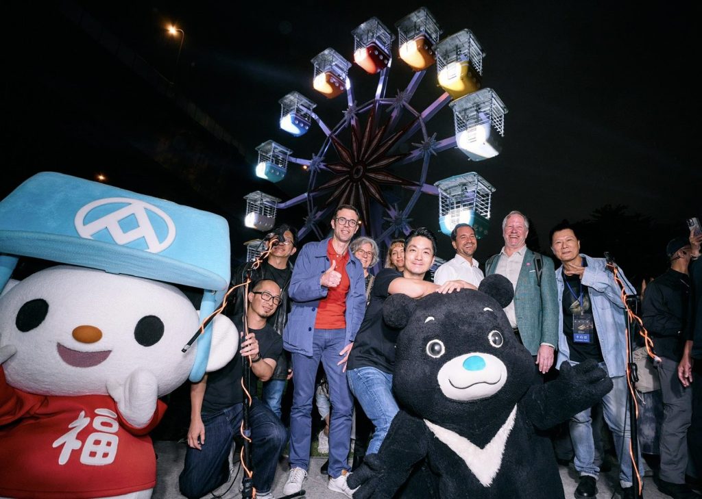 儀式結束後,蔣萬安市長與貴賓們在藝術總監黃彥穎陪同下,陸續參訪多項臺灣藝術家的白晝之夜作品。一行人首先欣賞藝術家江忠倫與林建志的作品《黑夢—狛犬》,緊接著來到了今年最大亮點之一,為藝術家姚仲涵創作的大型聲光裝置《光電獸#45-請支援收音》,此作品由全聯福利中心獨家贊助,邀請民眾以聲音點亮摩天輪,那熟悉迴盪於全聯門市的音樂與日常聲響,被轉化為流動的光與節奏,為城市的夜揭開閃耀的序幕,現場氣氛熱烈。此時,「熊讚Bravo」與本次熱情贊助的全聯福利中心吉祥物「福利熊」驚喜現身,掀起全場歡呼,許多民眾紛紛拿起手機合影留念,迎來全場最高潮階段!隨後依序參觀了藝術家廖建忠《運轉生活的終點站》以及藝術家蔡文章與賴彥均《一首歌掉在了地上》作品。