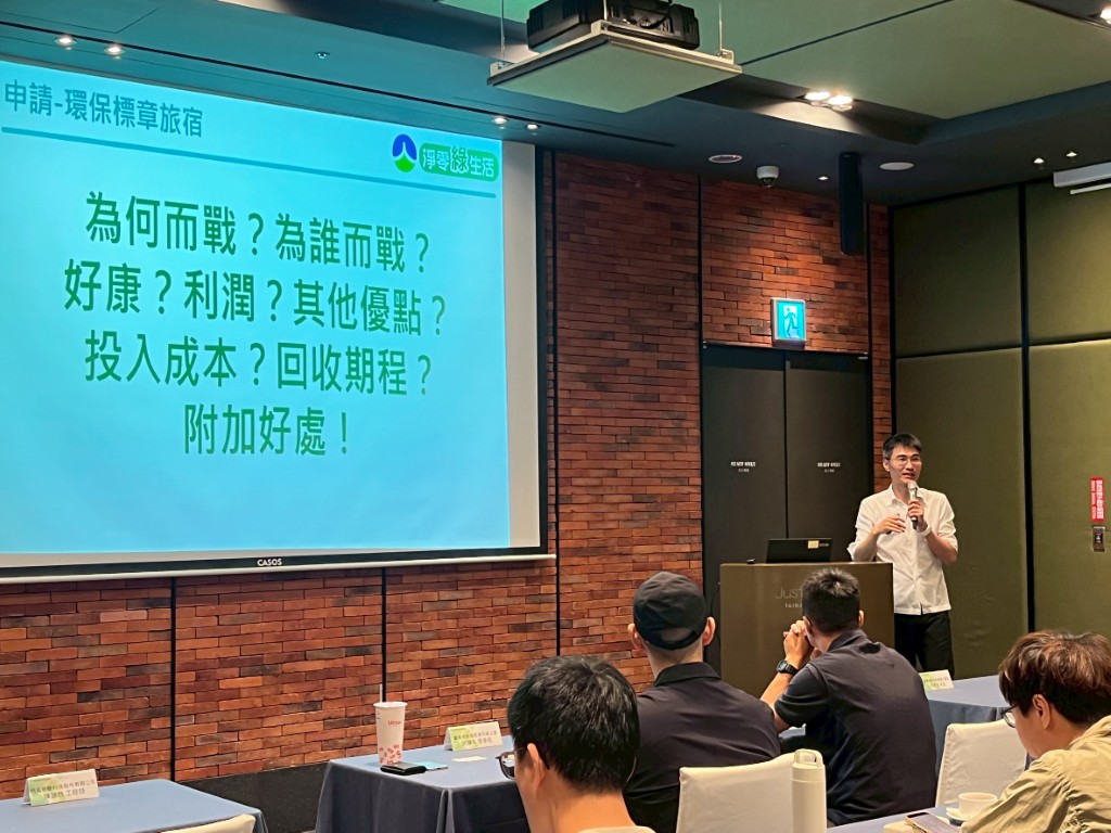 呂忠奇於旅館業者教育訓練中分享綠色旅宿的實務經驗(圖/環保局提供)