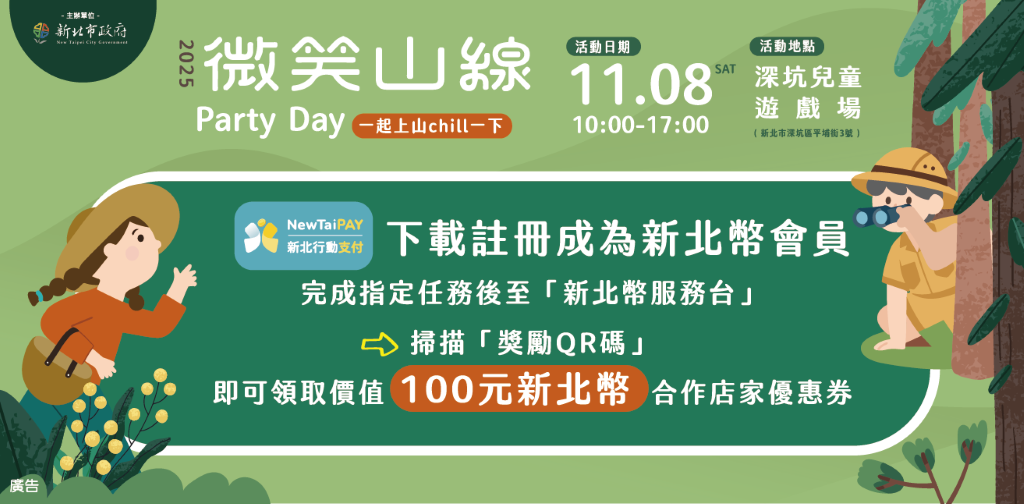 觀旅局提到,Party Day活動內容有趣味好玩的闖關、知識競賽以及手作體驗、精彩豐富的舞台表演及優質特色的「森Chill市集」,本次也邀集微笑山線五家服務據點與15家獨立品牌攤商,販售文創、手作與山城特產,並導入「新北幣 NewTaiPAY」數位支付回饋機制,只要完成指定任務即可領取100元新北幣合作店家優惠券,鼓勵民眾以行動支持在地店家,形成社區正向循環。