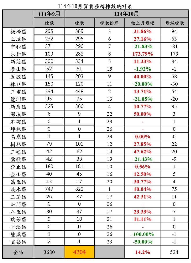 新北市政府地政局今(3)日表示,114年10月房市交易移轉棟數共計4,204棟,較114年9月增加524棟,增加幅度14.2%。
