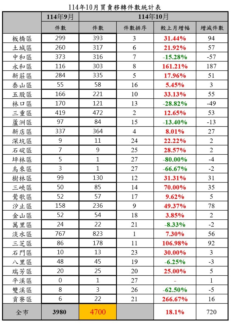 地政局指出,其中交易移轉棟(戶)數以永和區、板橋區、淡水區增加較多,與114年9月相較分別增加179棟、94棟、75棟,分析原因係本月份新成屋大批移轉棟(戶)數及中古屋移轉棟(戶)數增加所致。另以交易案件量(包括土地及房屋)來看,新北市114年10月交易件數為4700件,較114年9月增加720件,增加幅度18.1%。