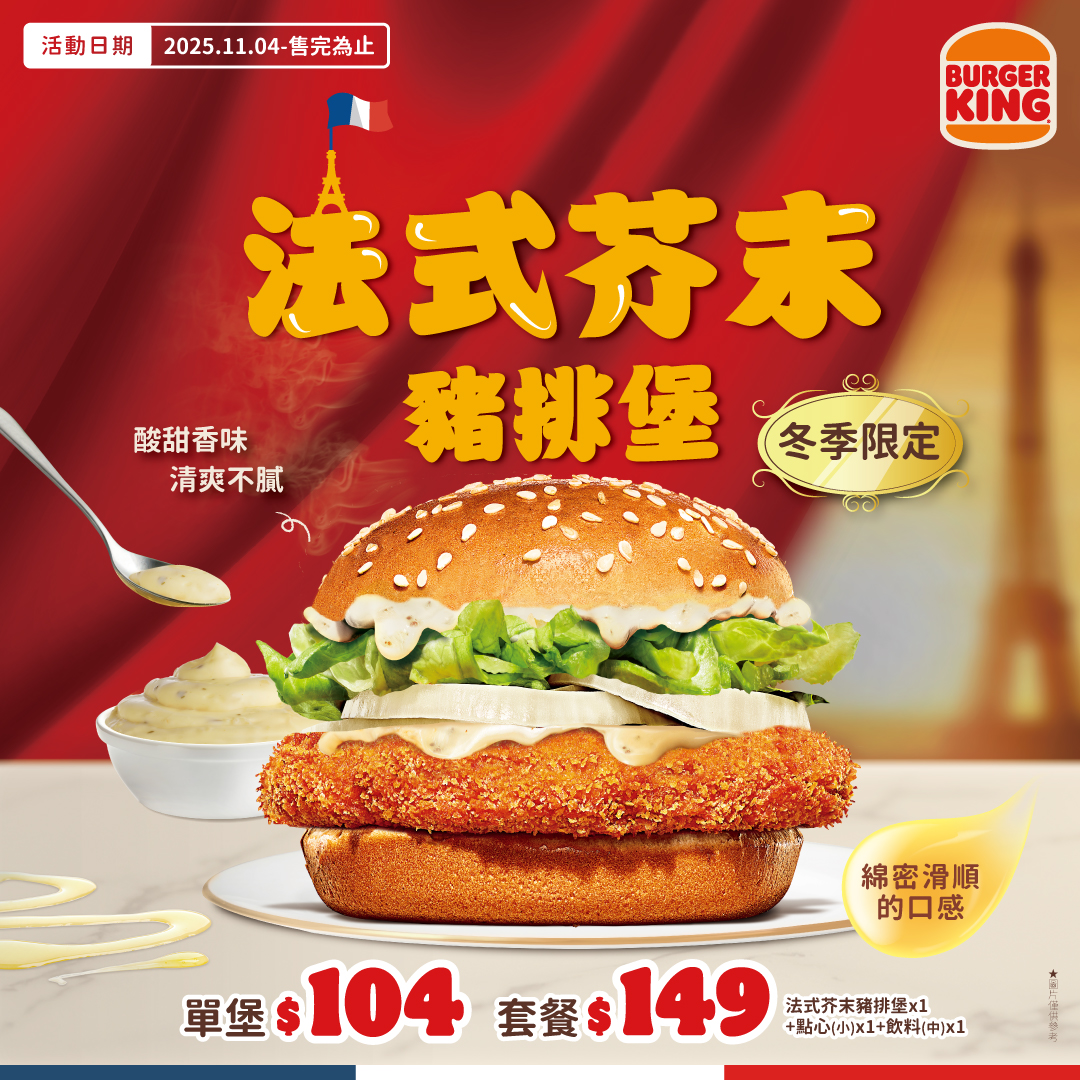 喜歡嘗鮮的朋友注意啦!漢堡王本月將推出2款全新口味漢堡,滿足更多元的消費者需求。結合「厚切炸豬排」和「法式風味」,扎實的口感與清爽醬料的搭配宛如戀愛的滋味,法式芥末豬排堡將於明(4)日上市,給大家浪漫的秋季味覺體驗;另外也貼近時下蔬食風潮,為素食者打造的洋蔥圈蔬菜堡自週四(6日)起推出,多種蔬菜帶來豐富營養,輕盈價只要59元就能嘗「纖」。