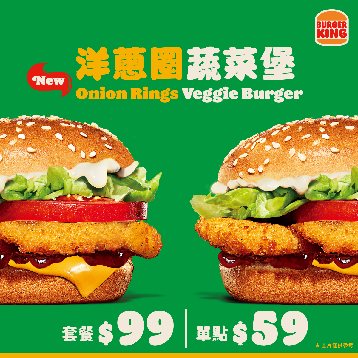 洋蔥圈蔬菜堡(單點59元)則因應素食者需求,設計出鍋邊素者可食的漢堡,有澎湃的生菜、番茄,配上烤肉醬與美乃滋的雙重口味層次,並堆疊著受到不少鐵粉愛戴的酥炸洋蔥圈,外層香酥、內餡綿密帶洋蔥香氣,還有起士片增加鹹香濃郁感,一個漢堡就可以攝取到多種營養,又維持低熱量,讓身體清爽少負擔,將成為漢堡王常態菜單的「美味暨健康擔當」。