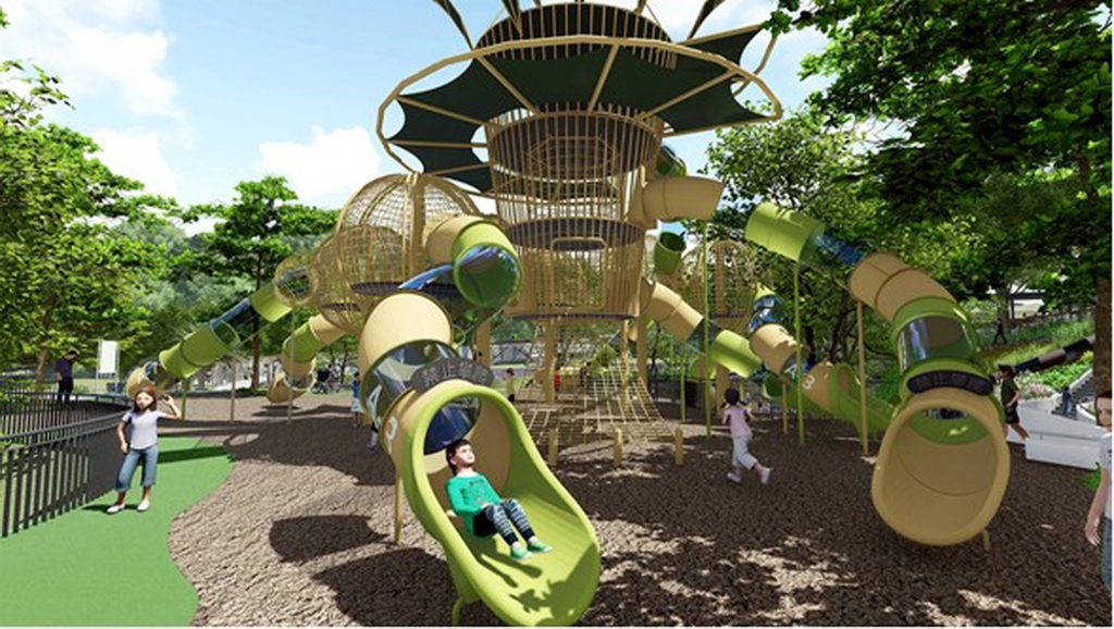 建設局表示,鰲峰山「谷溜遊戲場」基地面積達三千五百平方公尺,總經費七千六百萬元,目前工程進度已近百分之五十,預計於一一五年三月完工。工程內容包含主題遊戲塔、共融沙坑、高架歷史棧道等多元設施,並設置多達三十四道各式溜滑梯,打造兼具挑戰與趣味的遊戲空間。