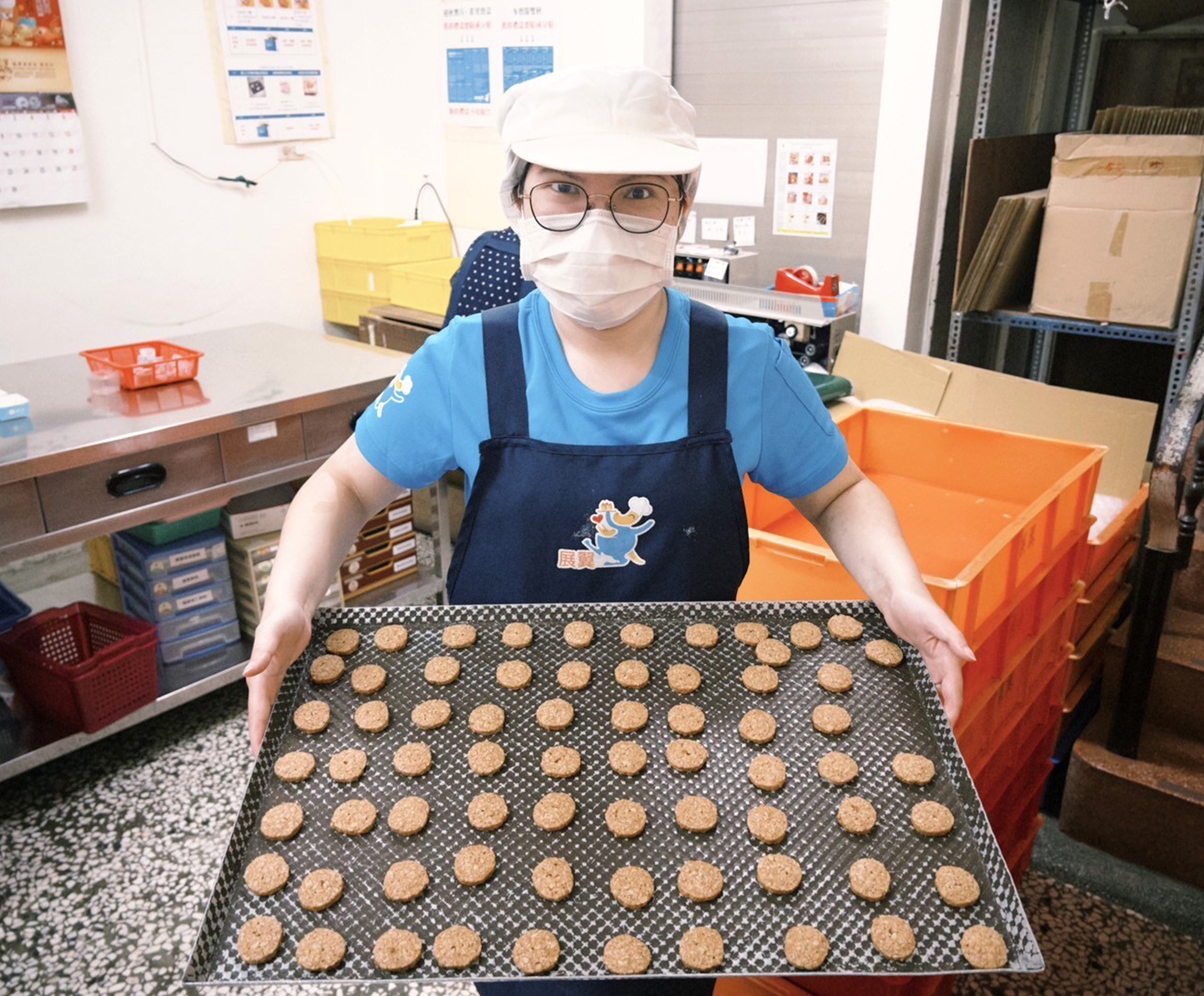 展翼的庇護員工「珍米」,在場內工作近七年,剛進入職場時,學習每件事對她來說都不容易,別人學一次就會,她要經無數次練習才能熟練;第一次搓的餅乾不但粗細不一,裡面有空洞,完全不像老師所說餅乾要像白報紙那樣的均勻、結實,切出來才不易碎;另外,包餡料從備料、秤重到油皮包油酥、餡料包裹,每個步驟都顯得艱難,尤其是「包餡」的環節,只要小細節沒做好,烘烤後可能露餡或變形,她一次次重複練習,雖有挫折感,但她不曾想過放棄。