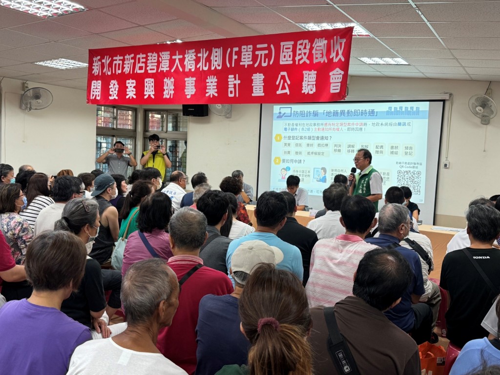 新北市地政局訂於明(5)日下午2時整,在新北市新店區頂城市民活動中心(新店區安康路1段9-2號)召開「新店碧潭大橋北側(F單元)區段徵收開發案」第2次事業計畫公聽會,將就計畫內容、區段徵收作業流程、重要時程與注意事項等再次說明,並將針對114年9月24日事業計畫公聽會暨地上物查估前說明會相關陳述意見處理情形逐一回應,亦聽取土地所有權人、相關權利人及利害關係人意見,為保障相關權益,歡迎踴躍參與。