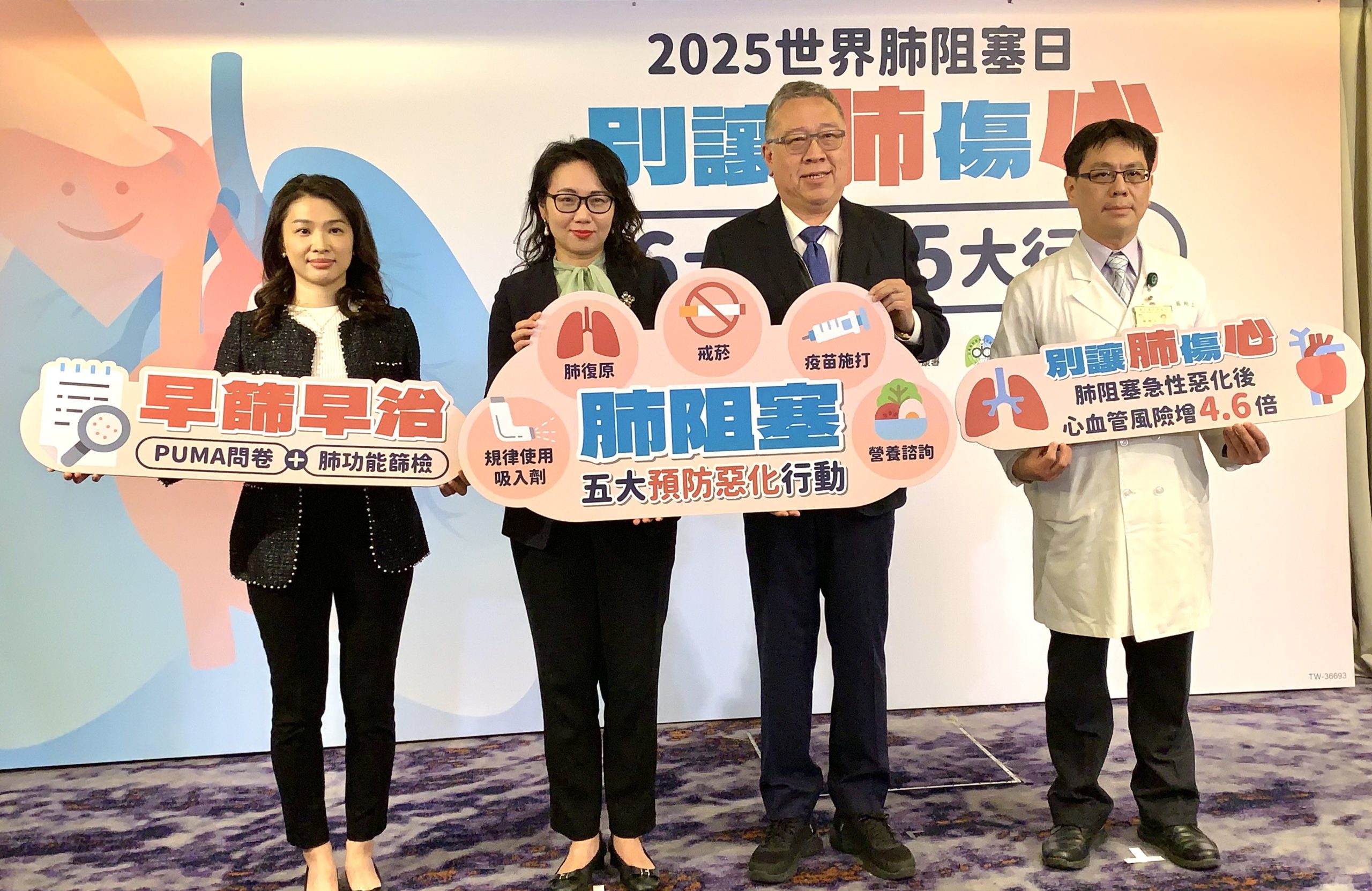 國健署長沈靜芬也呼籲,展開「戒菸」、「規律使用吸入劑」、「疫苗接種」、「肺復原」、「營養補充」等五大抗惡化行動保肺、護心,尤其「戒菸」更是預防與穩定病情的首要關鍵。