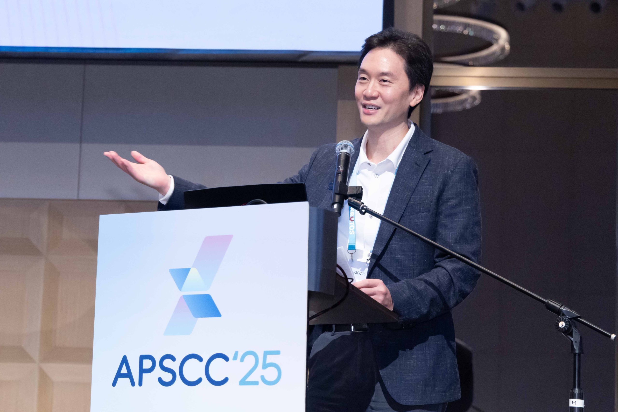 攸泰科技作為地主會員國申辦APSCC年會來台舉辦。首日開展,由攸泰科技董事長簡民智演講分享台灣如何以創新科技與產業鏈優勢串聯全球通訊生態。(攸泰科技提供)