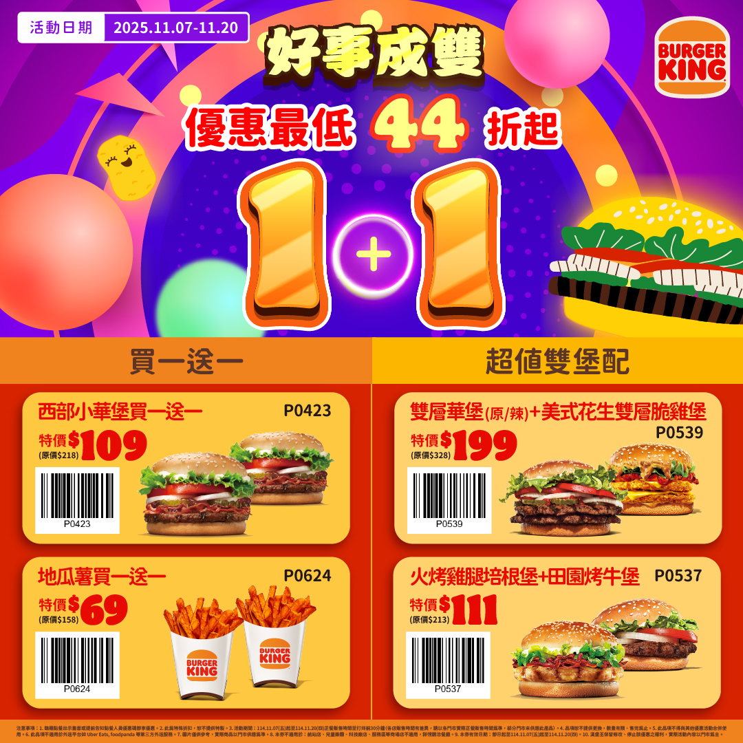 漢堡王改寫了買一送一的定義!適逢「雙11」將到來,漢堡王週五(7日)起推出「好事成雙」加碼優惠券,包括「買一送一」、「超值雙堡配」在內共計4項好康方案,美味和優惠通通無痛「DOUBLE」;其中地瓜薯可用優惠價69元入手,還直接升級成雙份,44折優惠實在不科學,比一般買一送一相當於5折價還更划算。