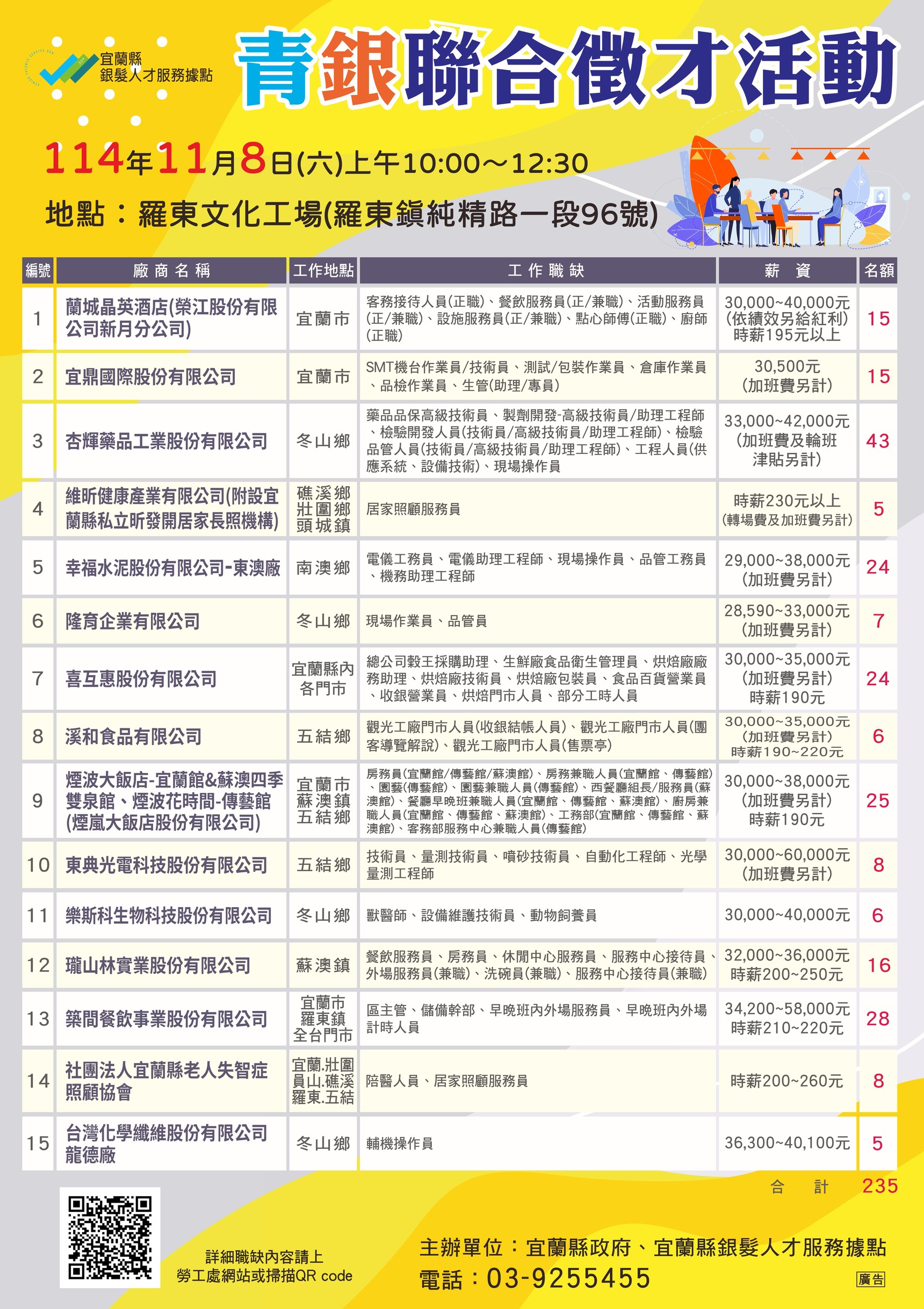 此次聯合徵才廠商包含飯店旅館、餐飲業、服務業、批發及零售業、資訊科技業、傳產製造業及生技類等縣內優質廠商,其中部分廠商有提供多元彈性工作時間之職務,吸引中高齡及高齡者重返職場,充實企業人力,並期盼透過青銀共事,為企業創造多元新價值。