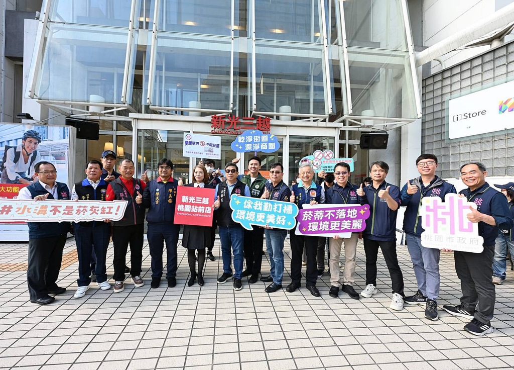 桃園市環保局為營造整潔舒適的城市門戶,五日上午在桃園新光三越站前店廣場舉辦「桃園火車站商圈淨街暨菸蒂不落地宣誓活動」,號召桃園火車站、衛生局、警察局、區公所、商圈店家、計程車業者、宮廟及環保志工隊等超過二百人共同參與,以實際行動展現打造無菸蒂環境的決心。