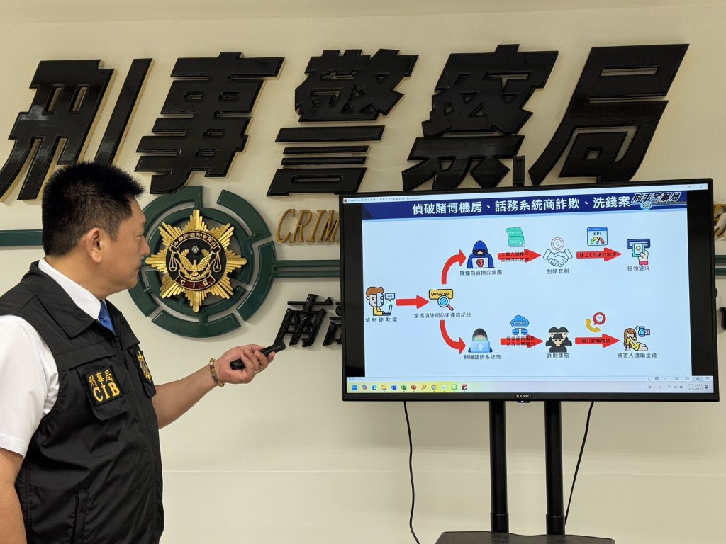 刑事警察局南打第三隊隊長王宥薦說明詐欺系統商及博弈洗錢集團運作手法,解析金流流向與犯嫌躲避查緝模式。(記者張翔翻攝)