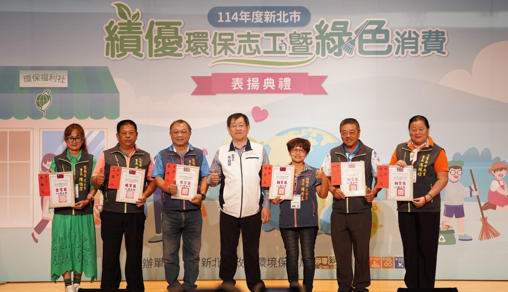 新北市環保局於昨(5)日舉辦「114年度新北市績優環保志工暨綠色消費表揚典禮」,共計表揚301個環保典範,包含3個績優民間團體、292位績優環保志工及6處績優環保福利社,肯定他們長期投入環境保護與推廣綠色生活的付出,展現實踐綠生活的努力與成果。