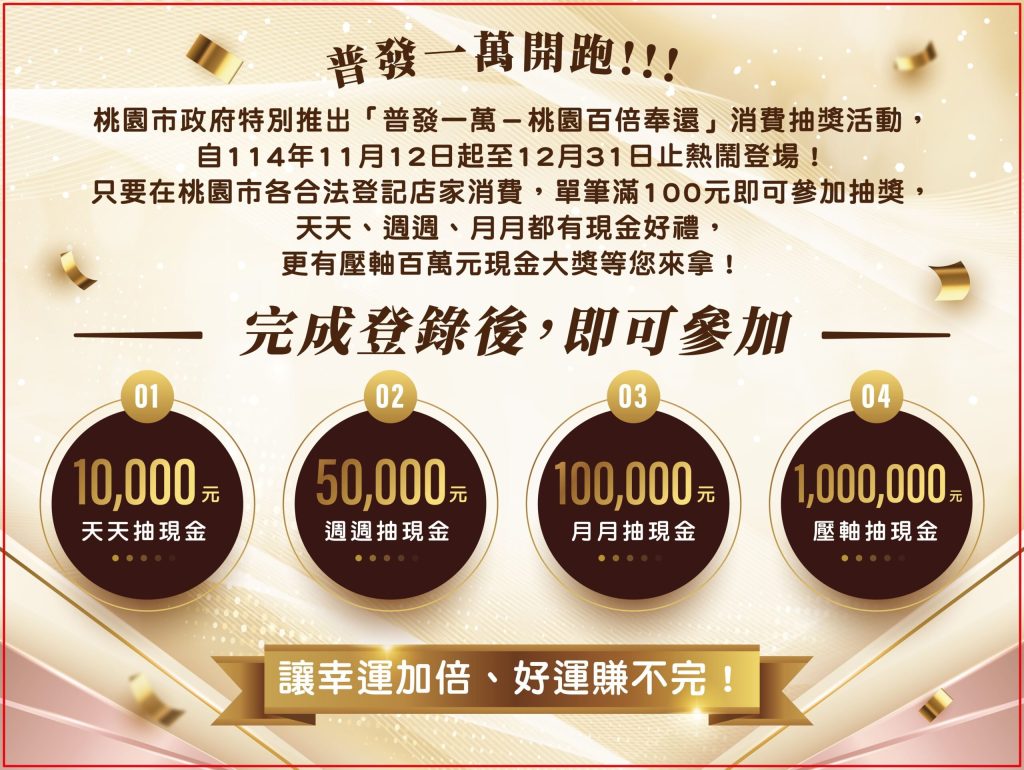 張誠也進一步指出,「普發一萬 .桃園百倍奉還」活動設有天天抽、週週抽、月月抽與壓軸抽等四大抽獎機制,分別為天天抽1萬元1名、週週抽5萬元1名、月月抽10萬元1名,以及最終壓軸抽100萬元現金1名。活動期間,經發局也將與在地商圈、觀光工廠及樂天桃猿球團合作,推出限量加碼好禮與體驗活動,吸引更多民眾前來桃園購物與旅遊,創造城市觀光與消費雙贏的經濟效益。