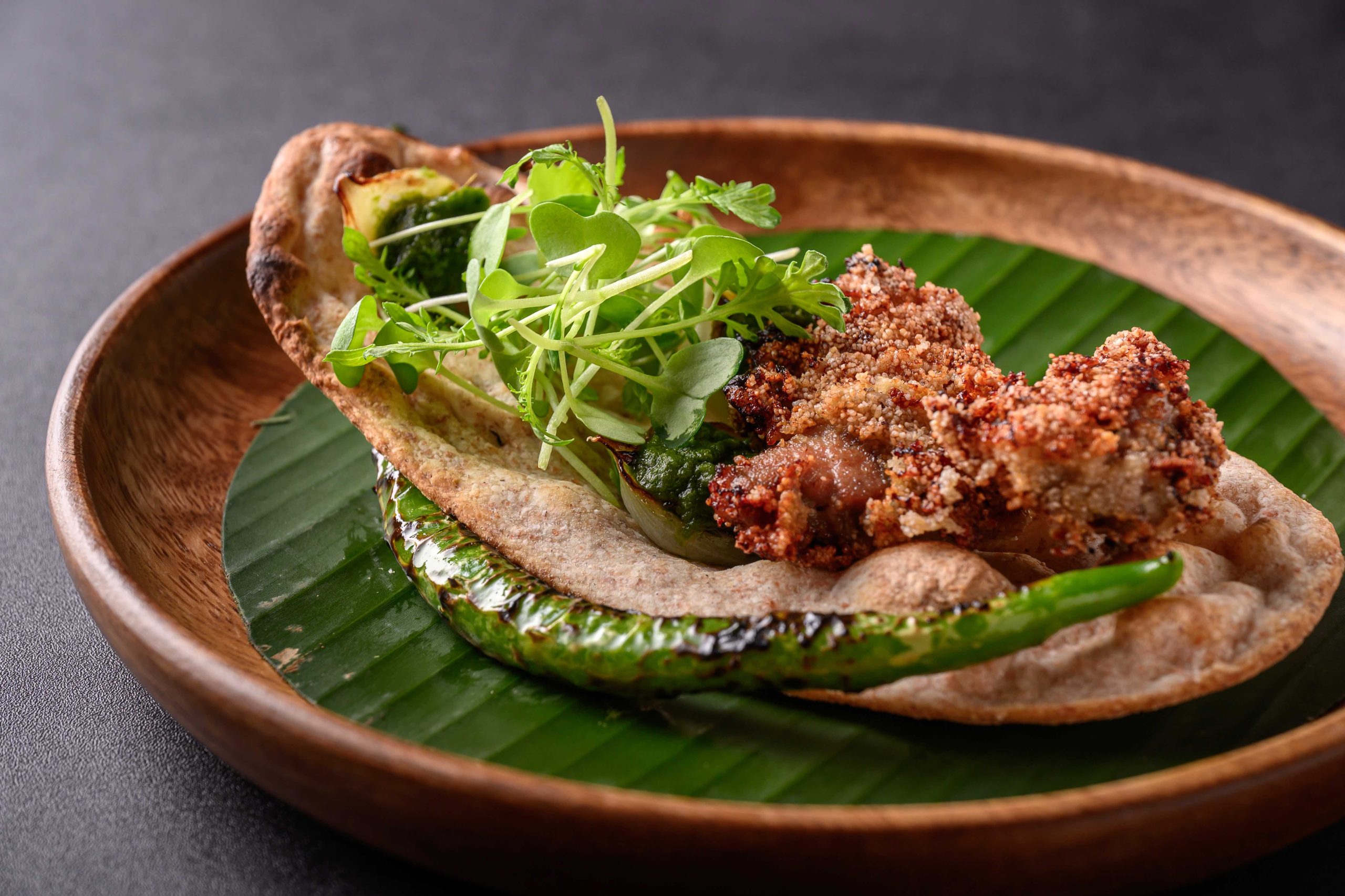 「果阿街頭的酥煎鹽麴小牛胸腺」復刻主廚 Joseph家鄉果阿的庶民小吃, Poee 是當地隨手可得的街邊小吃,外型如同口袋餅 pita bread,粗獷而樸實。Joseph與 Gayatri創意激盪後的重新詮釋是將慣常搭配的咖哩、雞肉等改以烹飪技巧更具挑戰的小牛胸腺,將之汆燙後以洋蔥、鹽麴醃製,裹上粗粒小麥粉以奶油煎香。品嚐時以Poee將小牛胸腺和用檸檬油、大蒜、丁香、肉桂與黑胡椒粒製成的香料醬(Cafreal Chutney)一同捲起享用,豐富口感與香氣,在迷人的咬勁中漸次展開,一秒置身印度街頭。
