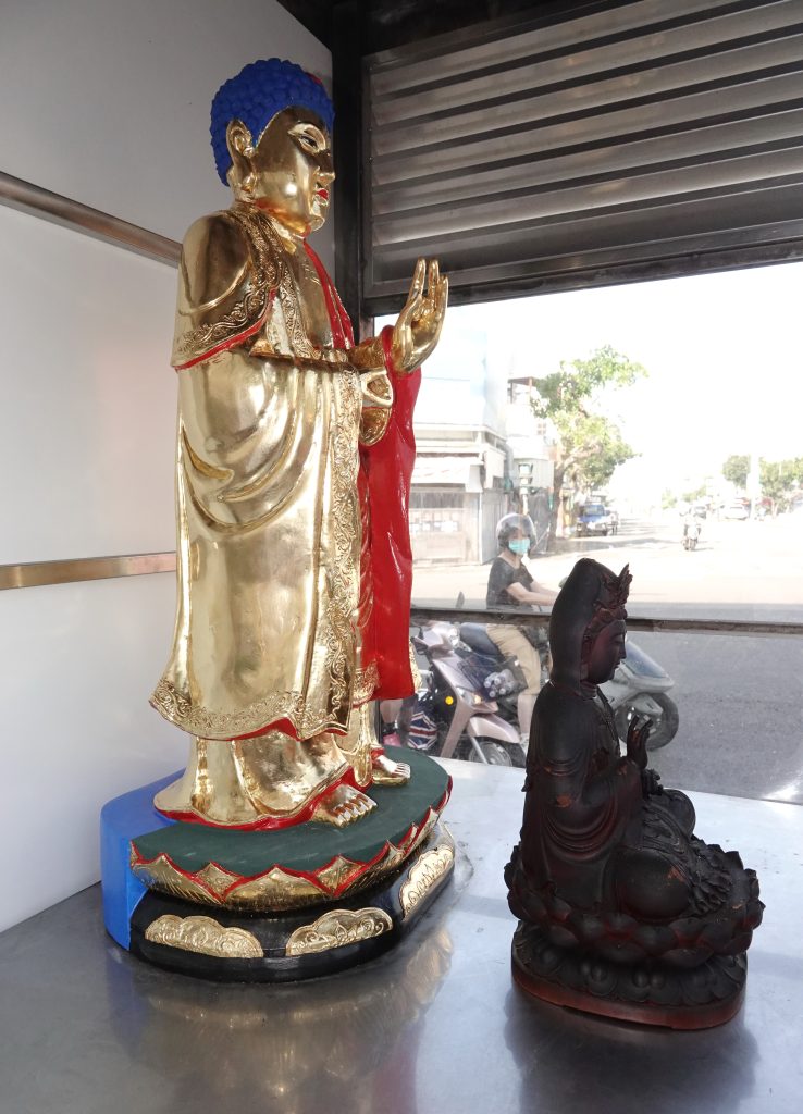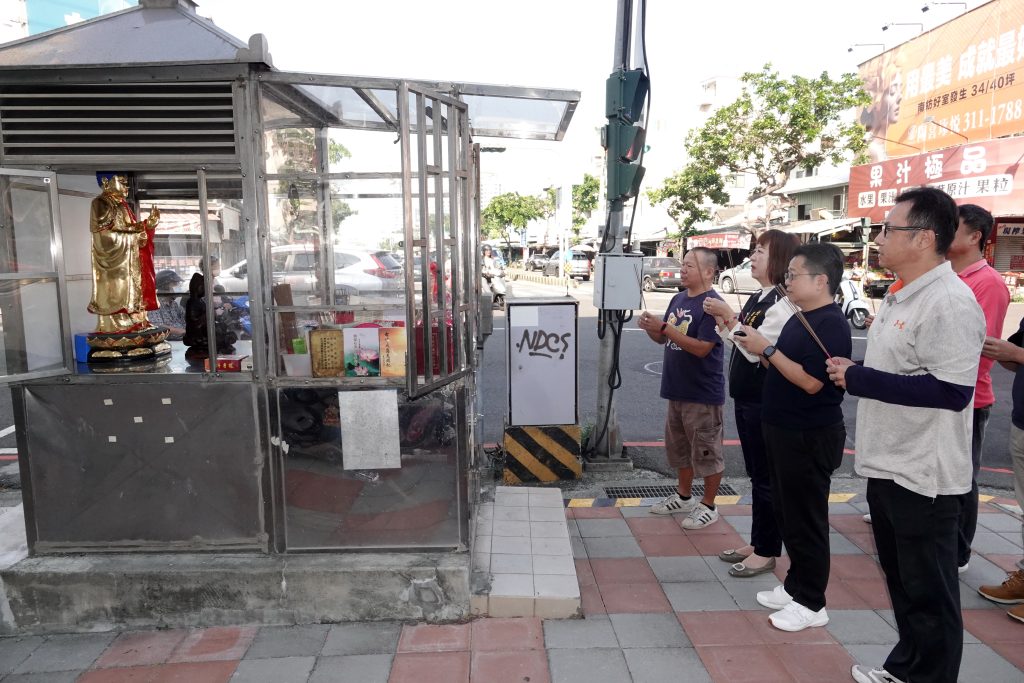 公園國小前守護交通繁榮馬路口超過一甲子的阿彌陀佛神像,因神龕通風不良加上年久失修「落漆」,經熱心的北區「好緣善意會」以及社團法人台南市回社慈善會幹部合資將神像送交「涿藝藝術製作工作室」重新粉光整理,六日上午回歸原位,繼續守護路口安全。