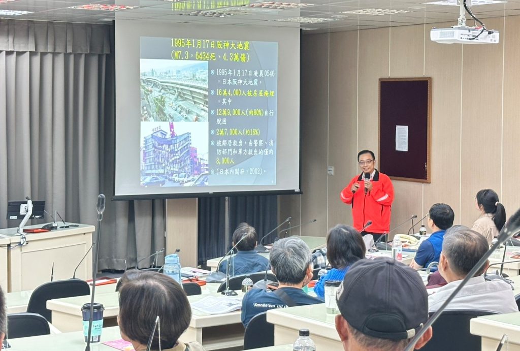 對於災害的防救災應變,消防局科長陳進源分享「推廣防災士」課題,強調從阪神地震經驗發展的「自助、共助、公助」精神,讓更多居民參與防救災,成為社區共助力量的一環。