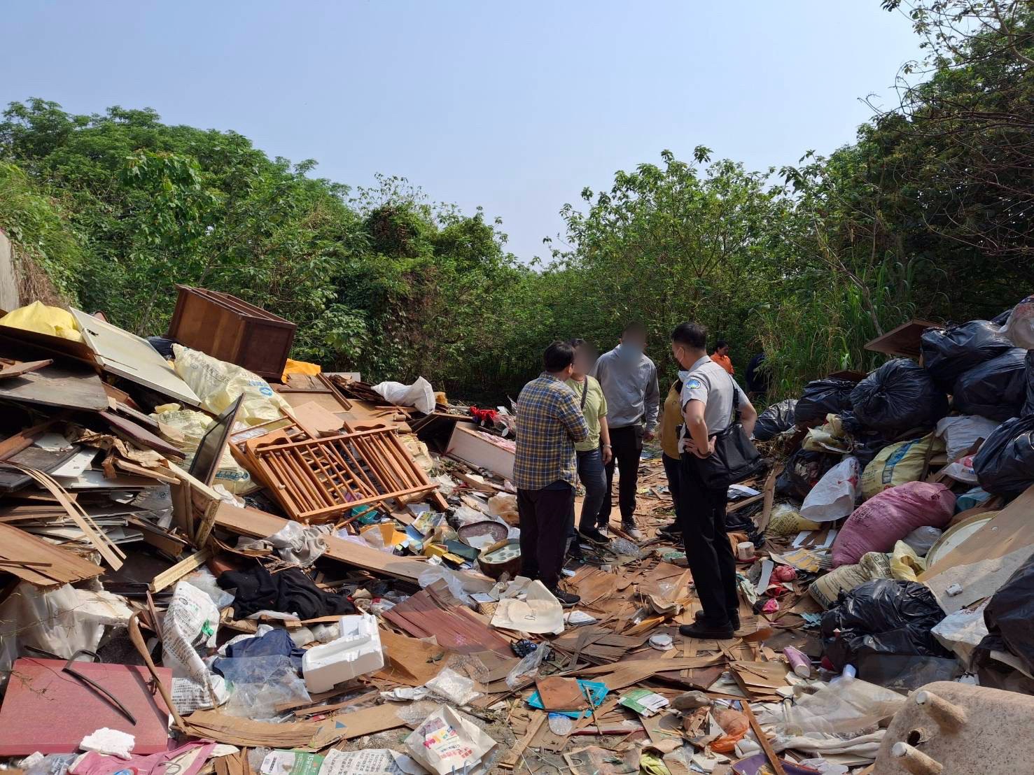 環保局與警方查辦仁德區非法棄置廢棄物案件,現場堆積大量家具與生活垃圾。 (圖/環保局提供)