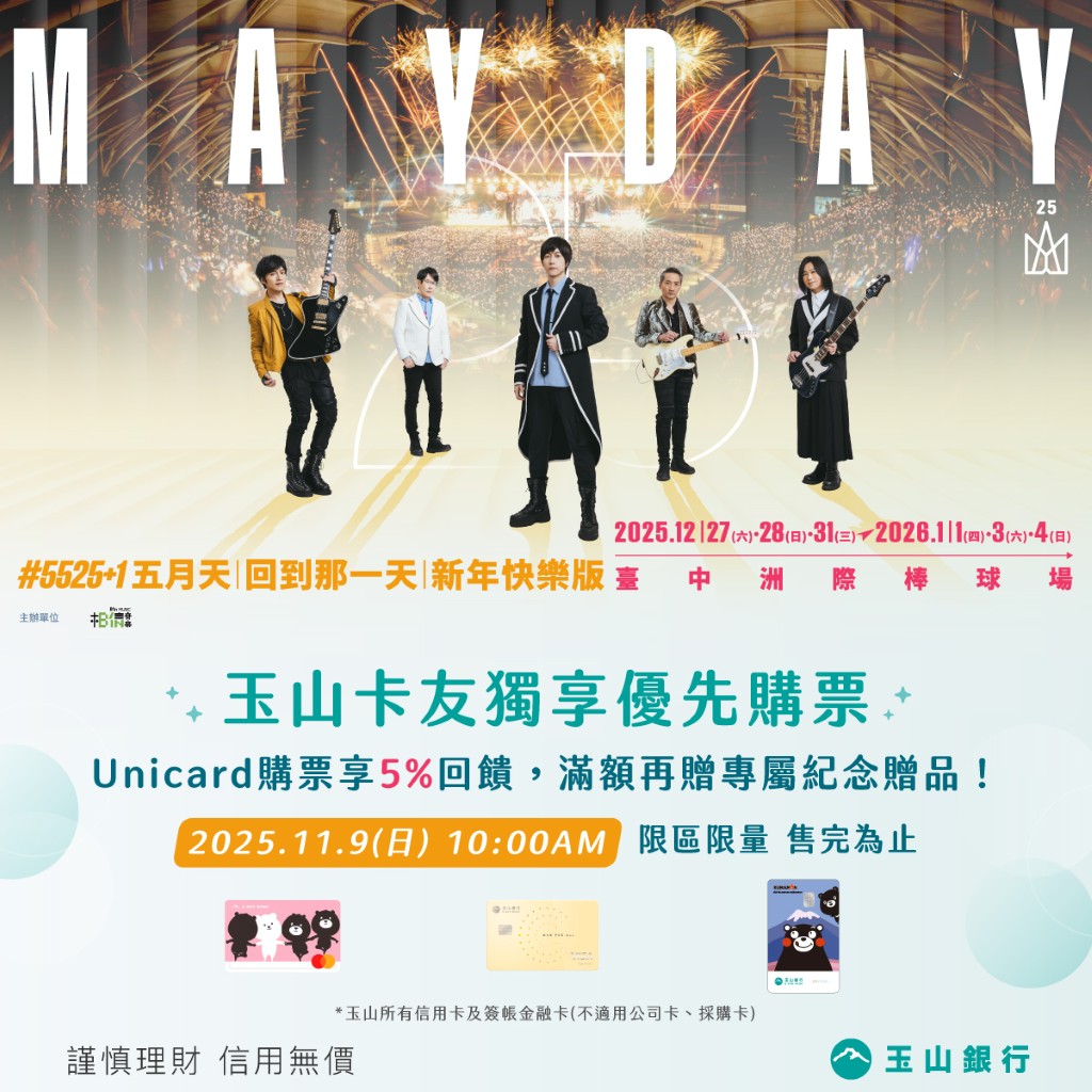 華人音樂天團MAYDAY五月天《回到那一天》25週年演唱會新年快樂版,將從2025年12月27日起,連續兩週在台中洲際棒球場舉辦6場演唱會,與歌迷朋友們一起迎接嶄新的一年。演唱會門票將於11月9日上午11點於拓元售票系統開放售票,本次五月天演唱會由玉山銀行金融業獨家贊助,為回饋廣大玉山卡友支持,所有場次皆特別規劃「玉山卡友專區」,提供所有玉山卡友可提前1小時於上午10點優先購票,請喜愛五月天的歌迷朋友們準備好玉山信用卡,把握難得機會!