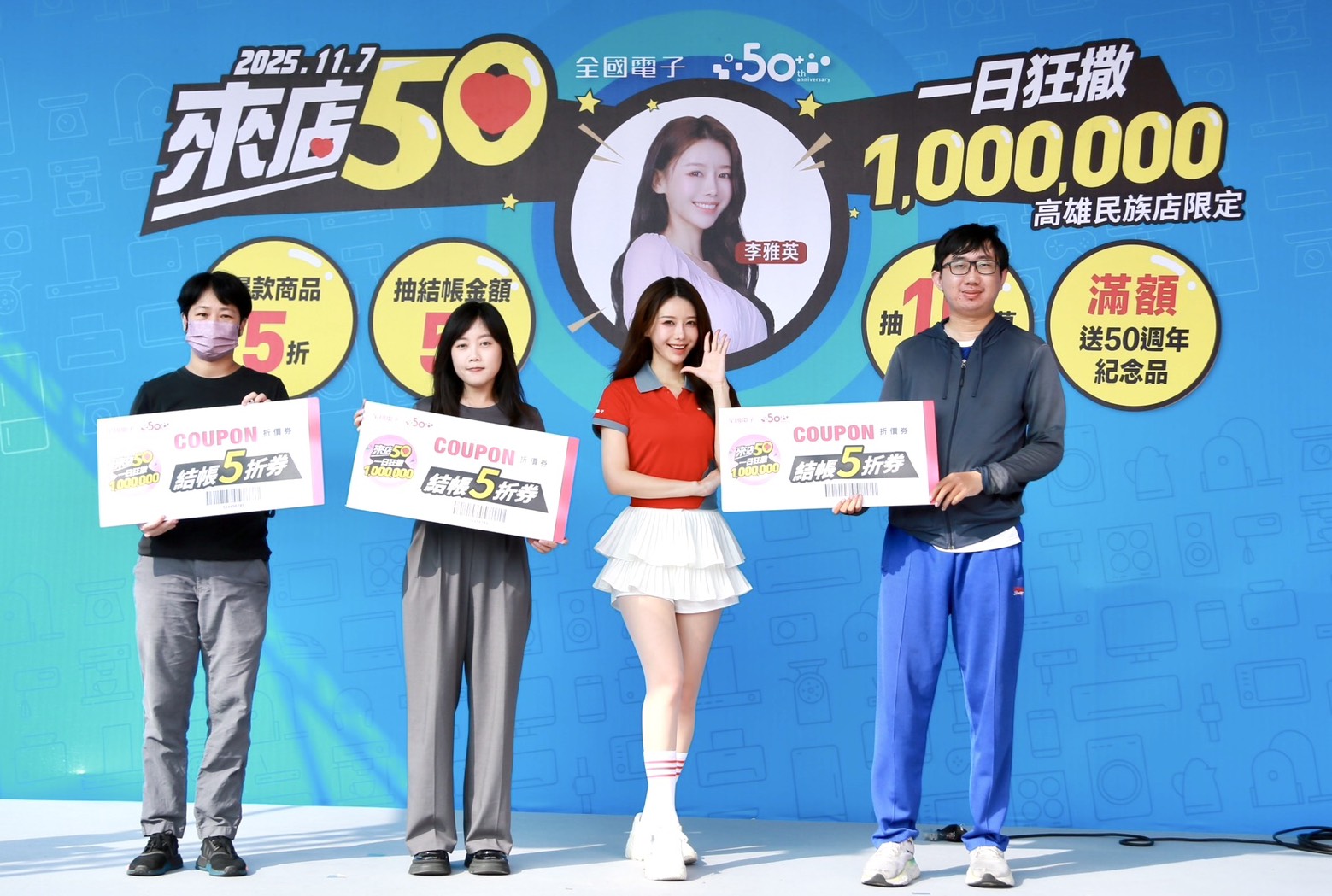 11月7日高雄民族店開幕首日,特別邀請應援女神李雅英擔任「來店50」一日店長,現場人潮爆滿、氣氛熱烈。李雅英親自體驗多項智慧家電,並與民眾熱情遊戲共舞互動合影。活動現場她更化身店長,親自介紹數位3C家電商品,展現專業又親切的一面;在家電拍賣活動中,李雅英更為得標粉絲親自結帳,現場粉絲直呼「太幸運了!」,氣氛High到最高點。「來店50」活動最終抽出三名五折券幸運得主,全場歡聲雷動,將開幕活動掀起最高潮。