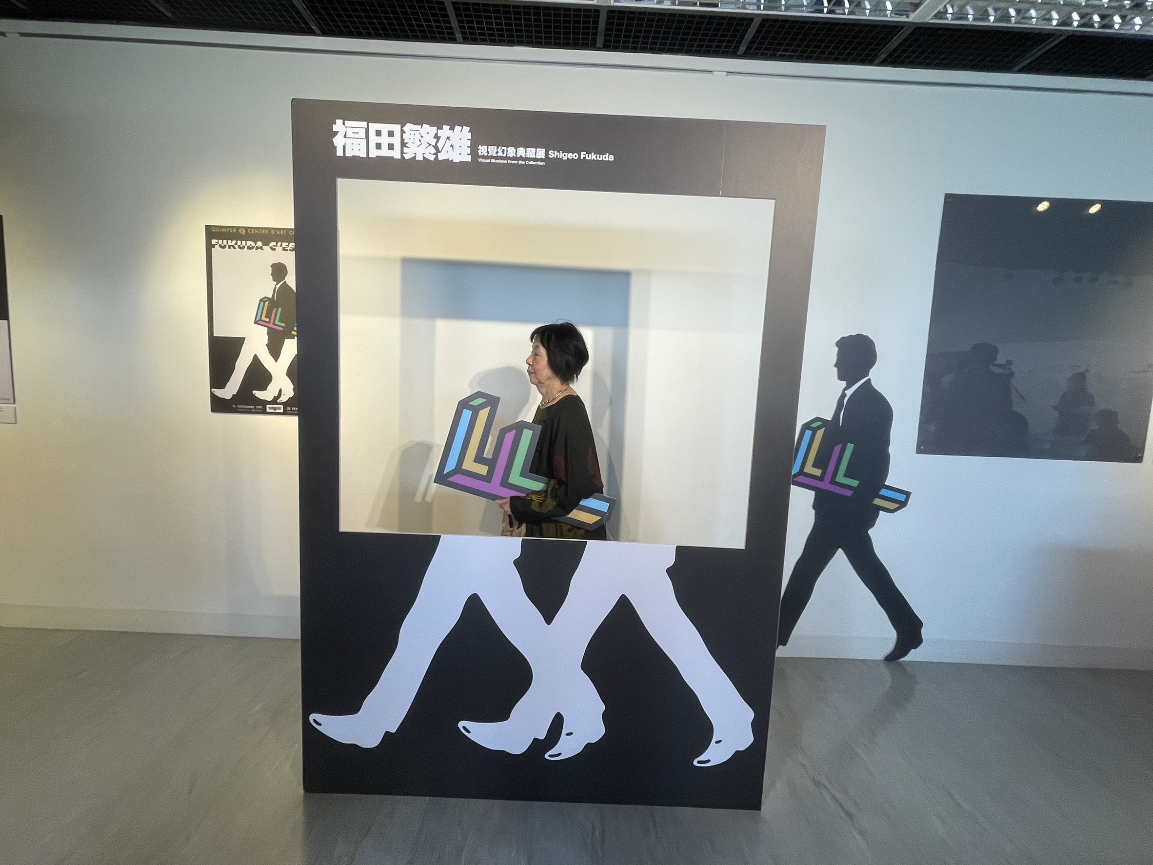 福田夫人跟其先生福田繁雄的作品一起進行自拍,非常有趣跟可愛。 (記者王正平翻攝)