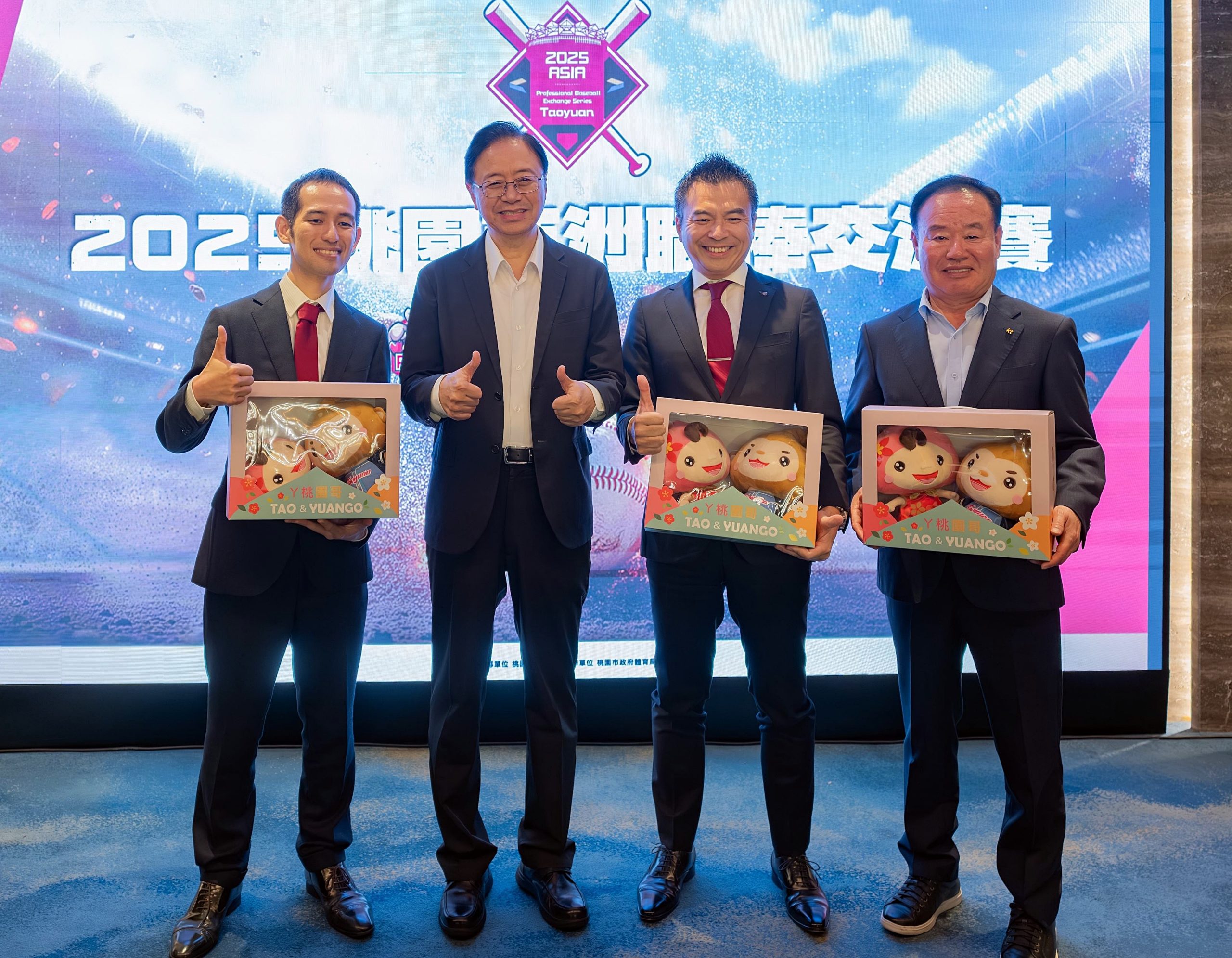 桃園市長張善政六日下午出席「二0二五桃園亞洲職棒交流賽」開賽記者會及晚宴,並致贈三個球團代表「ㄚ桃園哥」玩偶,象徵地主城市的熱情歡迎。張善政表示,本次賽事自七日起連續三天於樂天桃園棒球場登場,邀請韓國KT巫師、日本東北樂天金鷲及我國桃園樂天桃猿共同參賽,也期盼樂天桃猿延續奪冠熱潮,以球會友,深化臺、日、韓之間的體育交流,為球迷帶來精采的國際賽事。