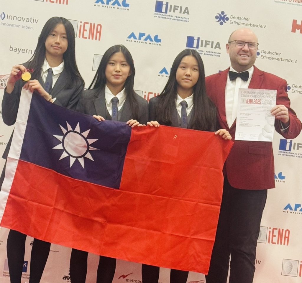 高雄美國學校學生施泱汝、千庾悧、徐睿俞指導老師曾詠辰、汪清文組成的代表團隊,參加今年第七十七屆德國紐倫堡國際發明展,以「下水道防堵裝置」作品,展現創新研發實力,技術亮點獲評審青睞,一舉摘下金牌,還獲得泰國辦展單位特別選出的特別獎。