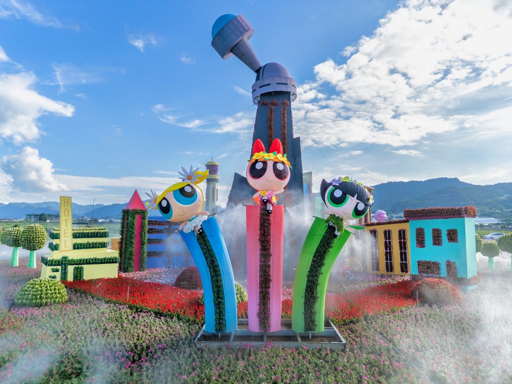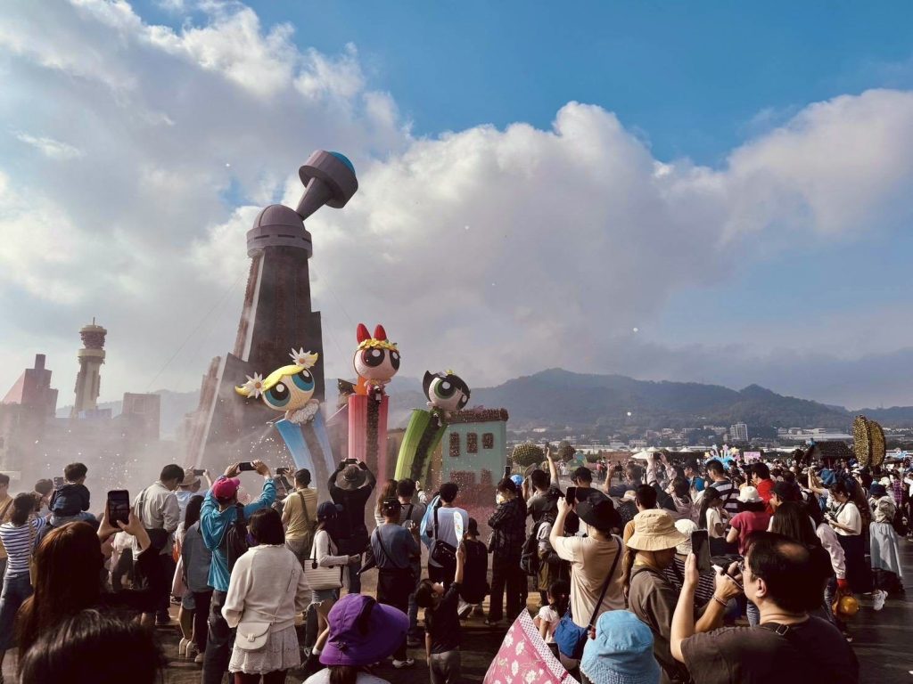 「二0二五新社花海暨台中國際花毯節」八日開幕,今年以卡通《飛天小女警》為核心主題,首日湧入大量人潮,接駁專車共發出數百班次。