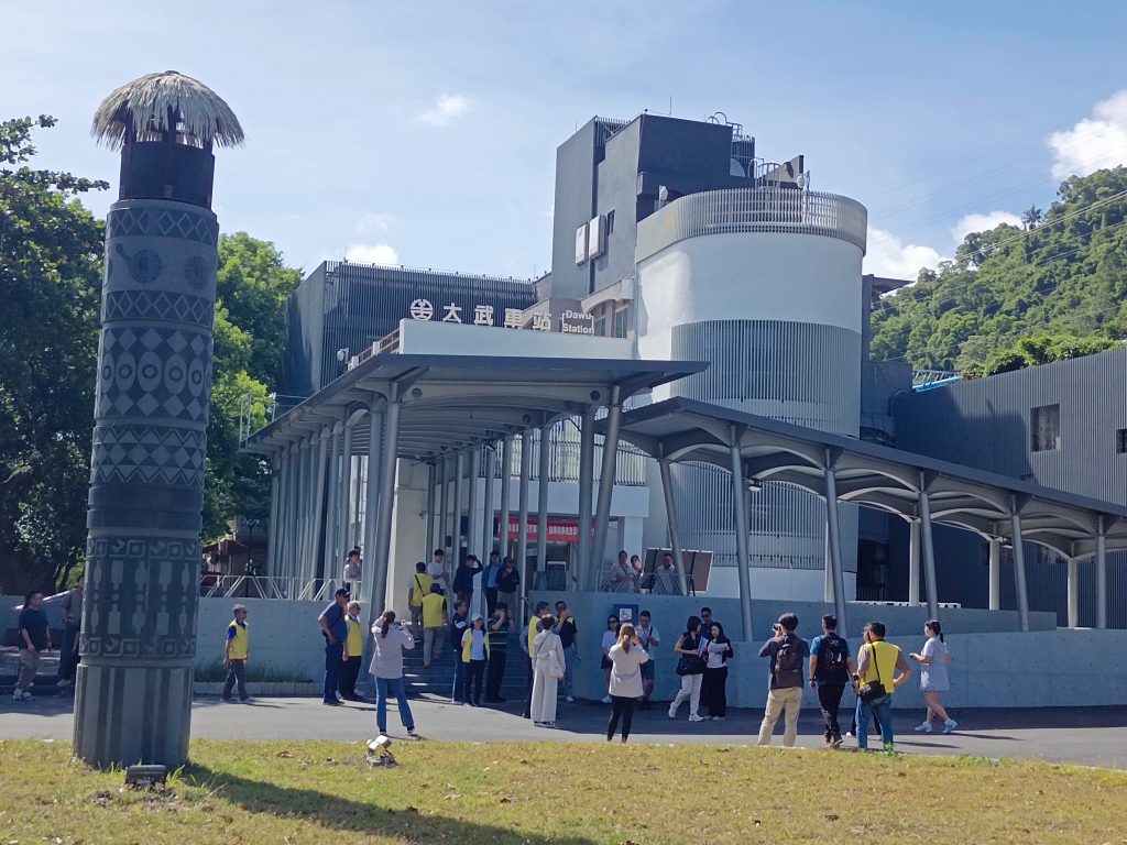 南迴鐵路之大武車站以山林及排灣族圖騰為設計,車站前的圖騰柱是由排灣族長老祭祀後設置。(記者傅希堯攝)