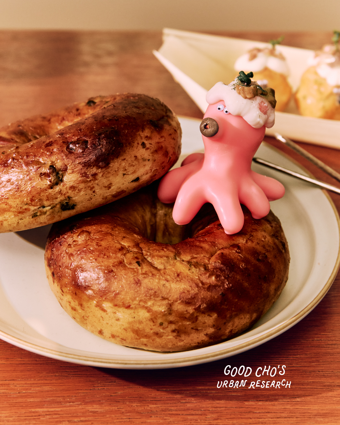 「章魚燒風味」貝果靈感來自 URBAN RESEARCH 的家鄉「大阪」。章魚燒是大阪街邊的靈魂小吃,也是許多人對大阪的第一印象。好丘 Good Cho’s 將這份街頭香氣搬進貝果裡:柴魚、海苔、鰹魚露醬油層層入味,為了追求比較好入口的口感,內餡使用香氣更加和諧的花枝丸並拌入 OTAFUKU 章魚燒醬,使彈性與甜度並存,一口咬下整個「大阪味」爆棚!
