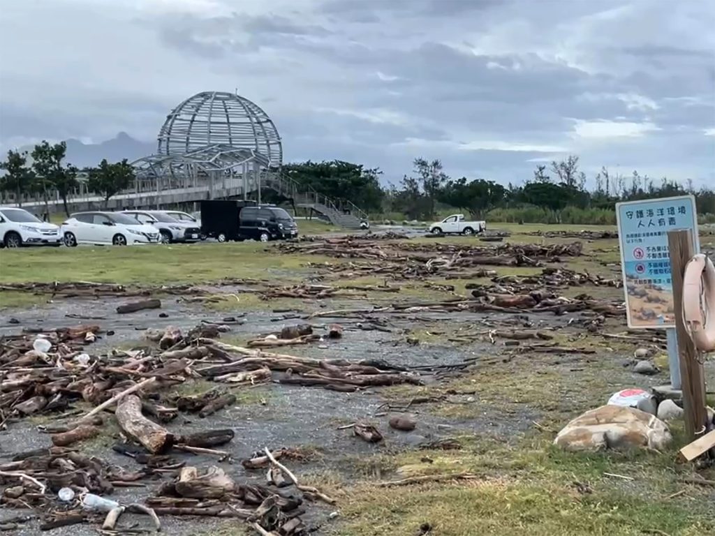 鳳凰颱風逐漸逼近台灣,台東受外圍環流及東北季風雙重影響,沿海風浪明顯增強。清晨時分,台東海濱公園驚現大片被巨浪拍上岸的漂流木,草皮與停車場遍布殘木枝幹,現場滿目狼藉,不少民眾頂著強風觀浪,驚呼「浪好可怕!」