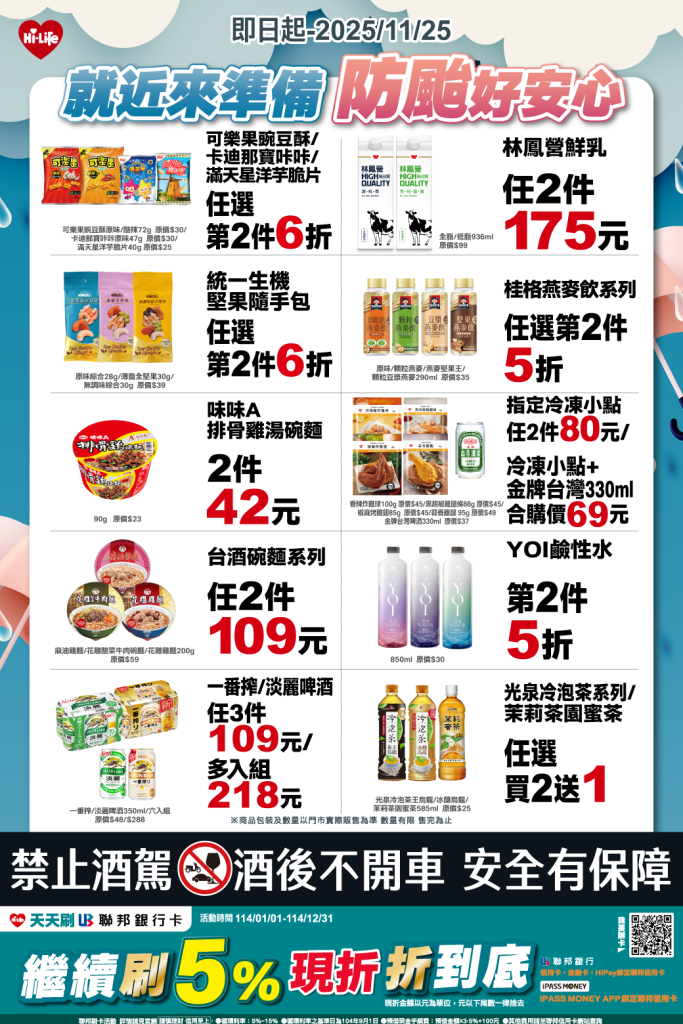 颱風「鳳凰」不斷進逼,中央氣象署於11月10日(今)發布海上颱風警報,受颱風外圍環流以及東北季風影響,雨勢有更加明顯的趨勢。萊爾富全台門市加緊戒備因應防颱,針對冷凍食品、泡麵、常溫冷藏飲品等較平時提高2至3成備貨、雨具、民生用品相關商品提高1至2成備貨。同時為滿足民眾採購防颱物資需求,即日起至11月25日於全台萊爾富門市祭出多項指定商品限時優惠,提供泡麵、餅乾、礦泉水或衛生紙等防颱必備物資,讓民眾就近採買,做好防颱準備。