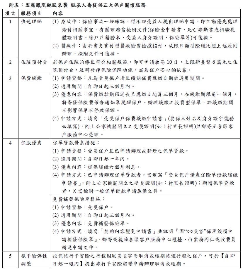 鳳凰颱風來勢洶洶,中央氣象署已發布陸上颱風警報,為因應颱風及其外圍環流可能帶來的強陣風、豪雨等衝擊,凱基人壽秉持關懷保戶、提供全方位保障的服務精神,主動關懷各地保戶受災狀況,給予必要之協助,第一時間迅速推出「快速理賠」、「住院預付金」、「保費緩繳」、「保服優惠」及「旅平險彈性調整」等五大保戶關懷服務 (詳見附表),讓保戶能獲得即時安心的保險支援,一同度過風災難關。