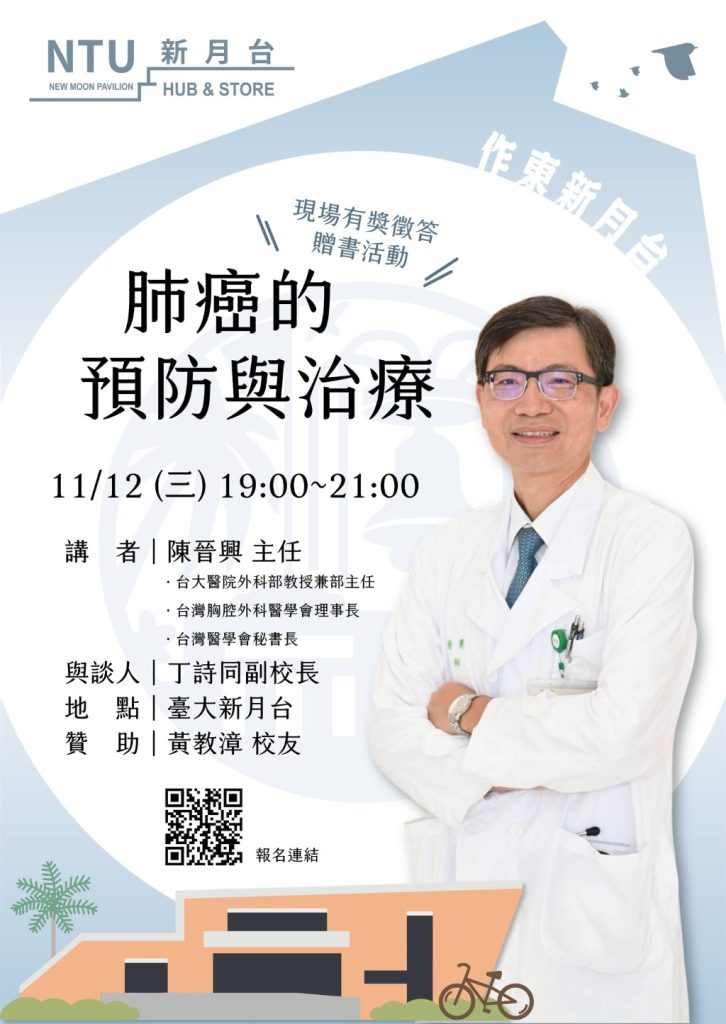 在台灣肺癌已經連續多年名列國人癌症死亡因素第一名,台隆集團黃教漳董事長特別贊助認識肺癌健康專題演講,由台大醫院外科部主任陳晉興教授,11月12日星期三晚間七點於臺大新月台NTU Hub & Store以〈肺癌的預防與治療〉為題,和大家共同討論身邊親友極可能發生的健康問題。 免費報名連結:https://www.surveycake.com/s/Y9rpv