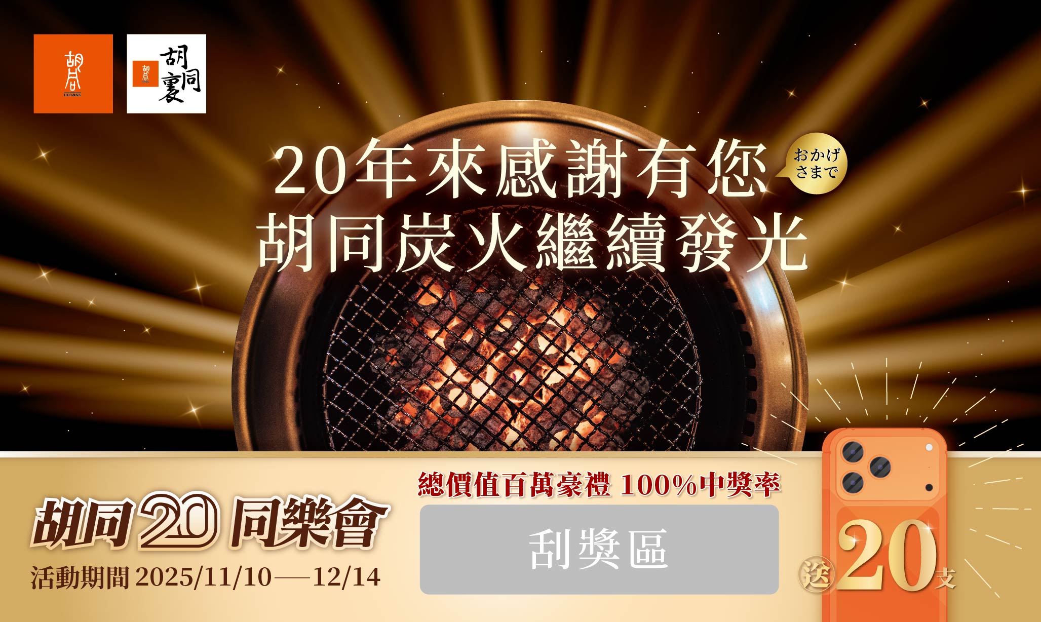 橘焱胡同表示,即日起至「胡同燒肉」、「胡同裏」、「角頭胡同燒肉酒場」,消費每滿3,000元即可獲得20週年慶活動刮刮卡乙張,張張有獎,消費越多、刮刮卡越多!集團旗下品牌「四代目菊川鰻魚飯專賣店」、「一幻拉麵」將於11/14一起共襄盛舉。呼應普發萬元政策,橘焱胡同也號召粉絲,來店用餐享「萬元放大橘手機」一起同慶同樂。