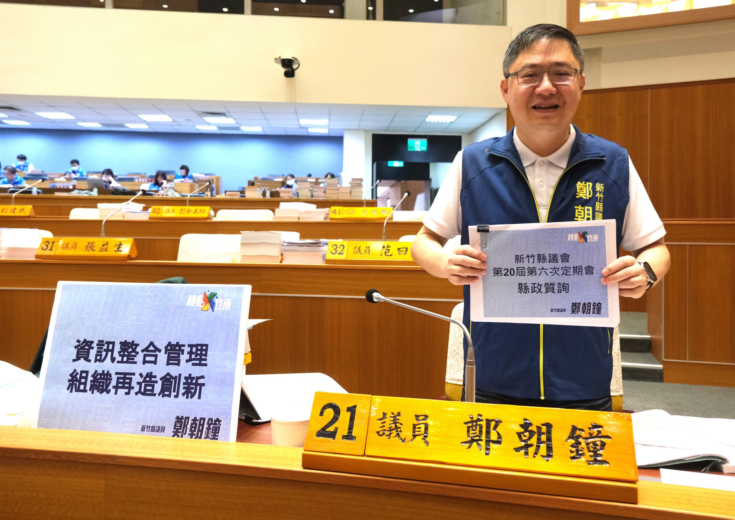 新竹縣議員鄭朝鐘十一日於縣政總質詢時,關心快捷八號車輛更新計畫及竹東學子搭乘通學的情況,也關切新竹縣治安,希望警察局建置更多監視器並維持良好妥善率,並詢問縣府整合各局處資訊平台、竹東親子館、消防設備汰換及街頭藝人等議題,新竹縣長楊文科及相關單位均一一答詢。