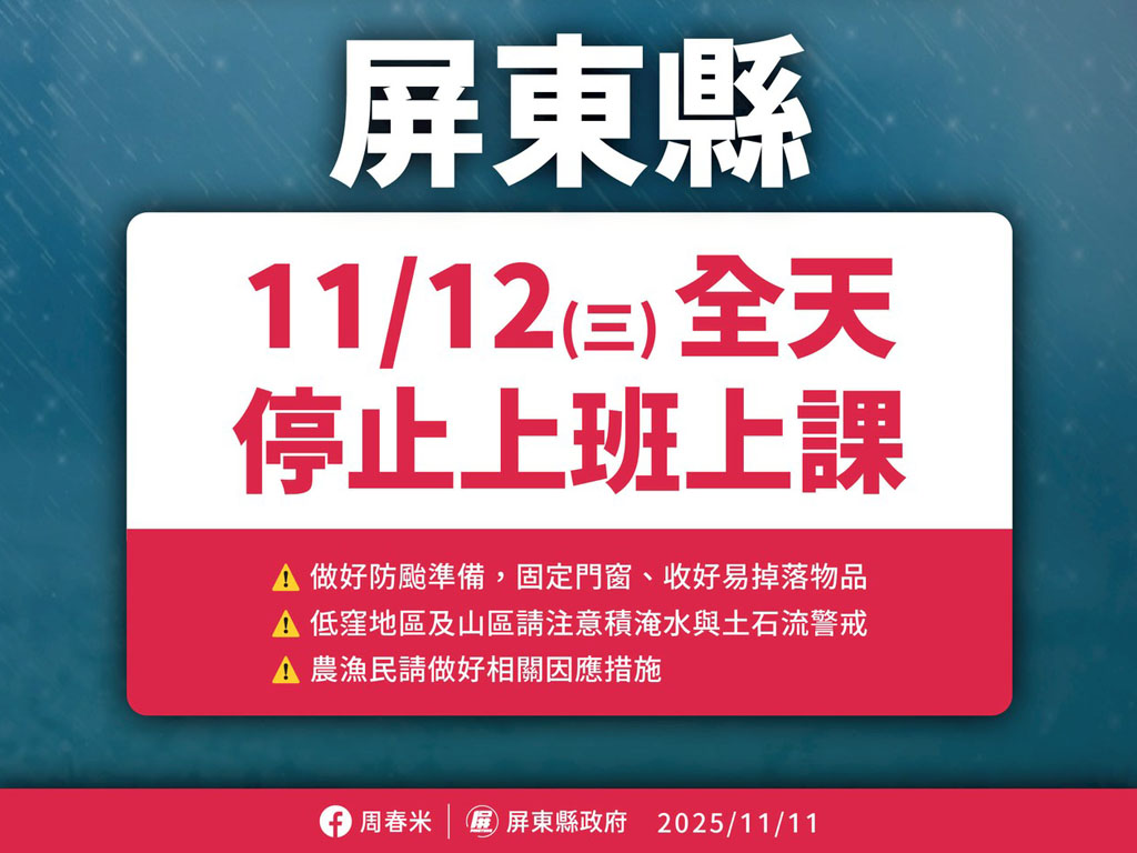 依照中央氣象署資訊,輕颱鳳凰暴風圈已接近西南方近海,屏東縣已列入陸上警戒區域,需嚴加戒備;且依據氣象署風力預測資料,並考量縣民出入安全,屏東縣政府宣布明(11/12)日停止上班、停止上課。