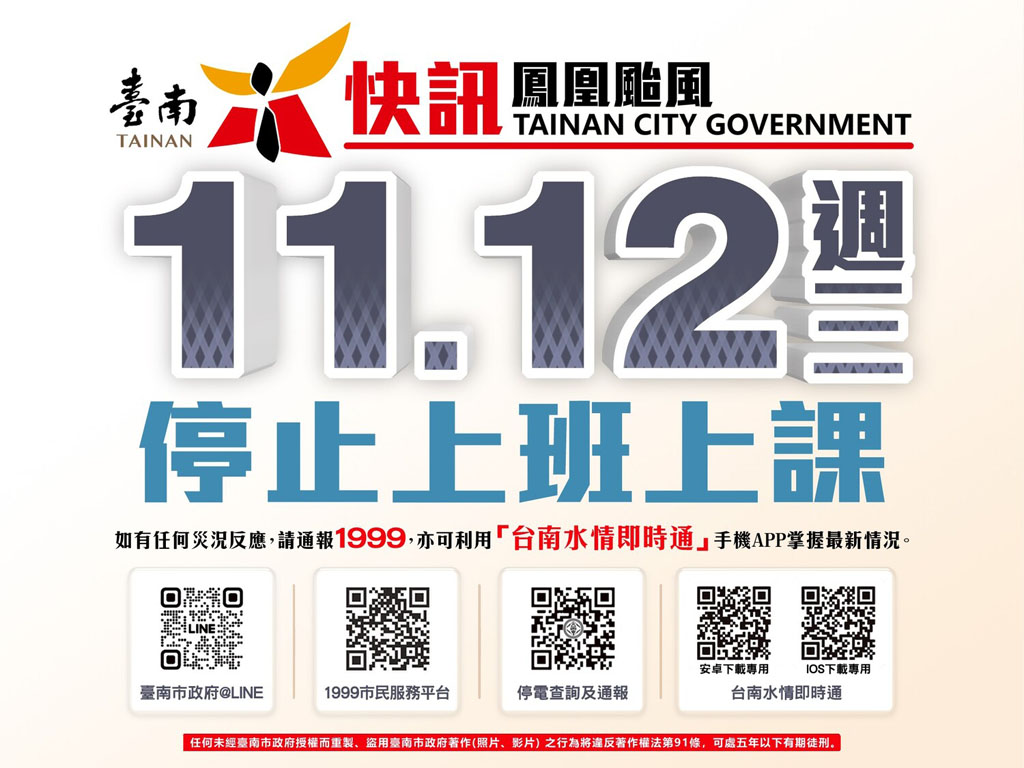 市府指出,氣象署的最新資訊顯示,十二日早晨至十二日晚上,台南市濱海地區風力預測平均風由五-六級轉六-七級,最大陣風由八-九級轉九-十級,考量風力有危及市民上班上課安全或有致災之虞,為維護民眾安全及各項整備應變作為,所以宣布全市十二日停班停課。