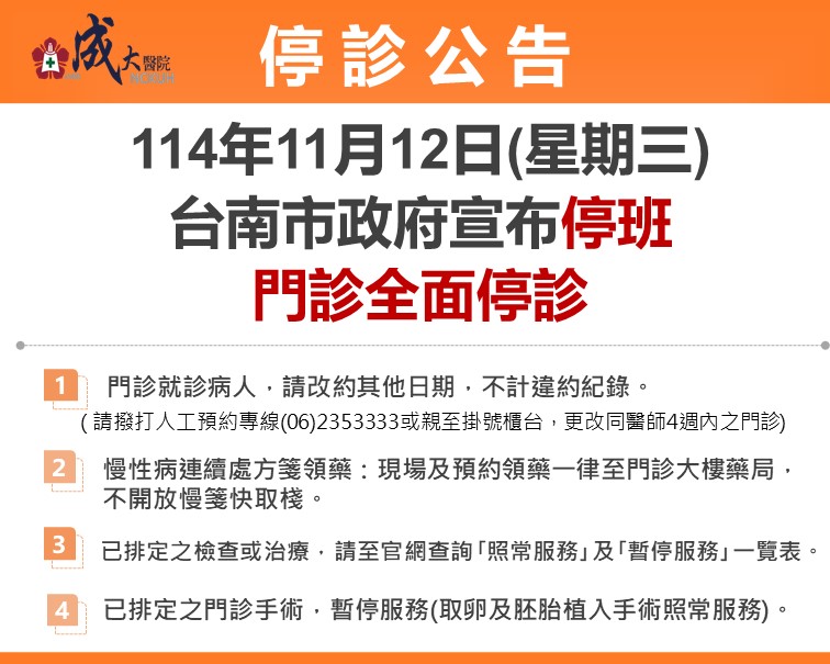 受鳳凰颱風外圍環流影響,台南市政府宣布十一月十二日(週三)全市停班停課。成大醫院發布公告,當日門診全面停診,提醒民眾勿冒雨前往就醫,以確保自身安全;急診與住院醫療服務則照常提供。