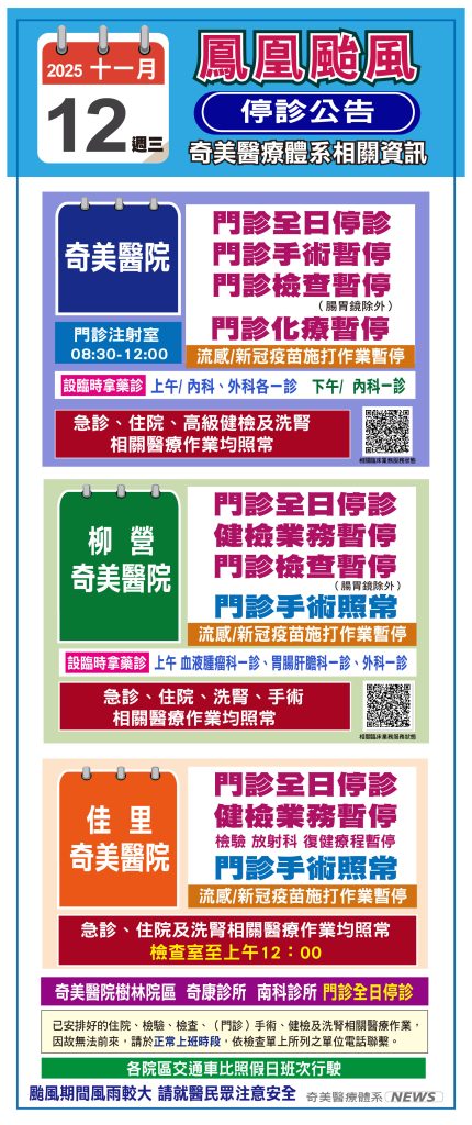 受鳳凰颱風影響,台南市政府宣佈11月12日停班訊息,奇美醫療體系相關醫療作業如下: