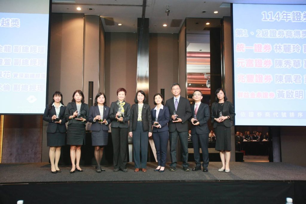 114年度證券商反詐騙評鑑活動頒獎典禮-卓越獎(得獎證券商為富邦證券、兆豐證券、永豐金證券、元大證券、凱基證券、群益金鼎證券、元富證券、統一證券,非照片中受獎證券商位置順序)。(證交所提供)